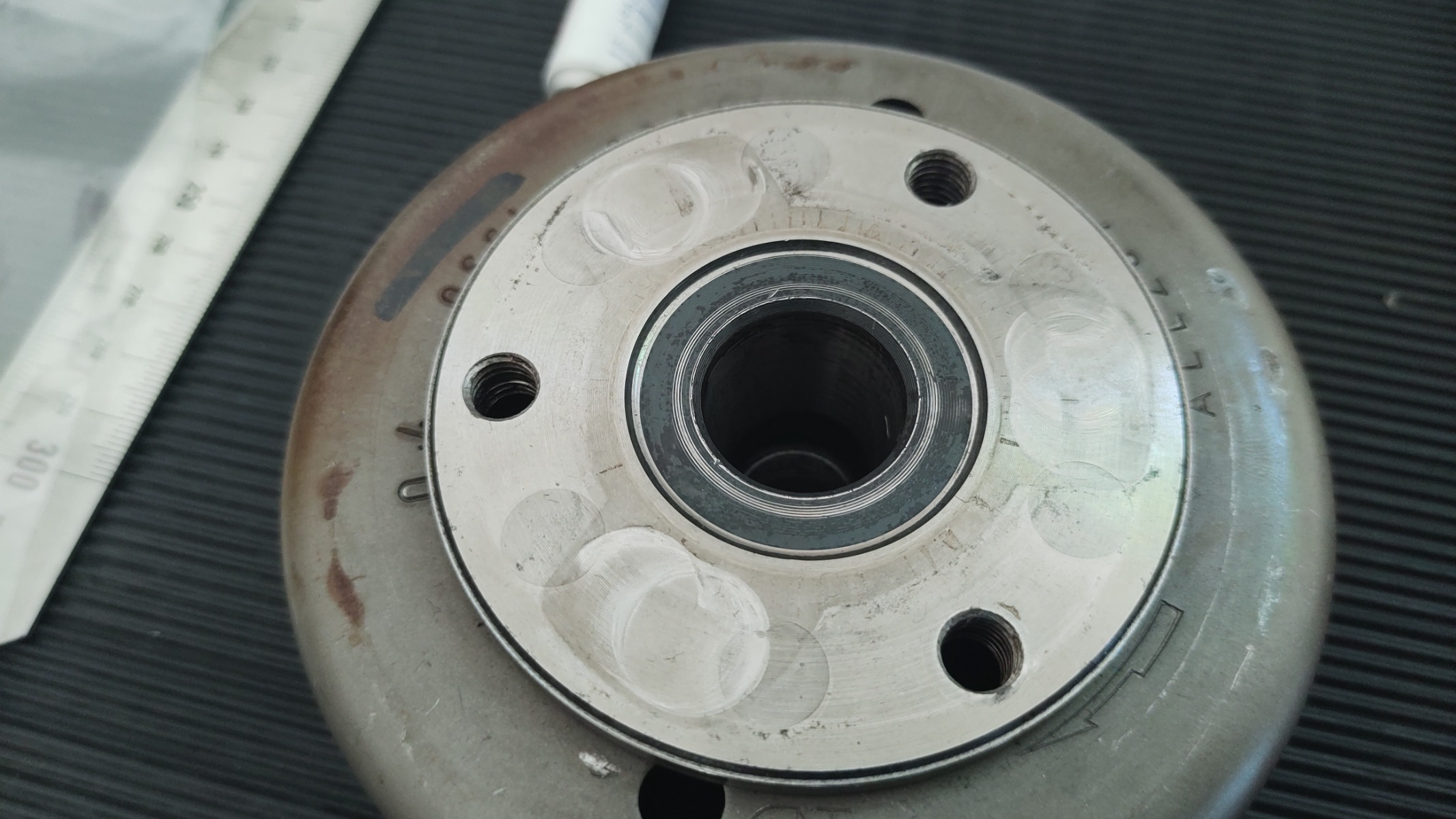 - It looks like the rotor I have has been scraping along the side of the aluminium adapter plate from my last post. Given the number of balancing divets I assume it's pretty assymetrical. It doesn't look too bad though (was scraping against aluminium), seems more like the outside has been polished up a bit by the adapter . Thoughts? Still usable without balancing?