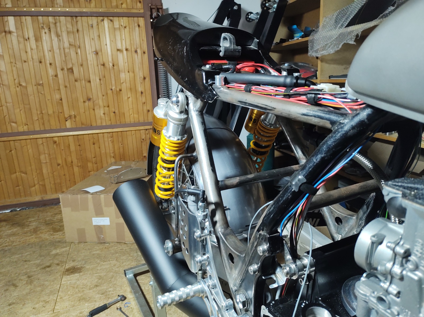 Got the front brake reservoir mounted today. Need a different bolt for the bracket (just used a banjo bolt with a load of washers to get the position sorted). Also shortened the oil cooler lines so they sit a bit closer to the engine. Ordered a 135° fitting for the rear to take the kink out of the hose. After that I started sorting out the wiring for the rear indicators - will get them fitted tomorrow and post some pics.