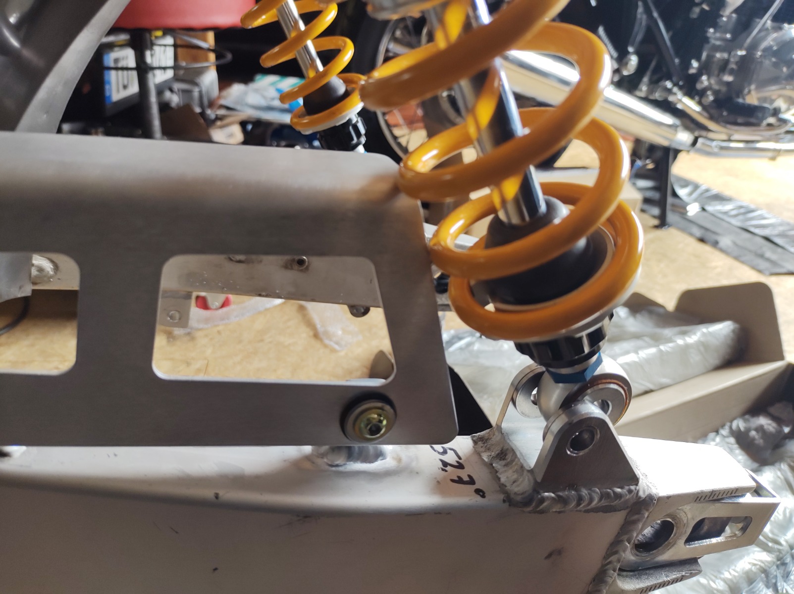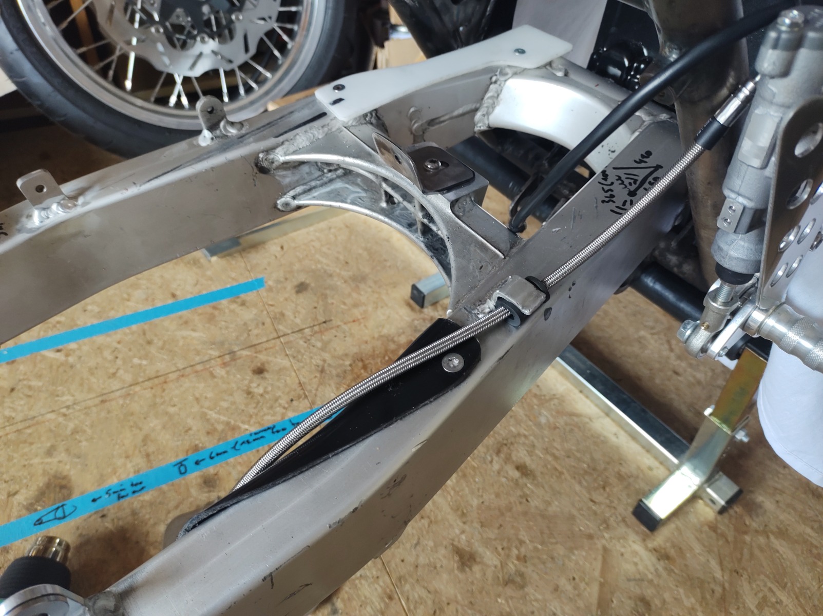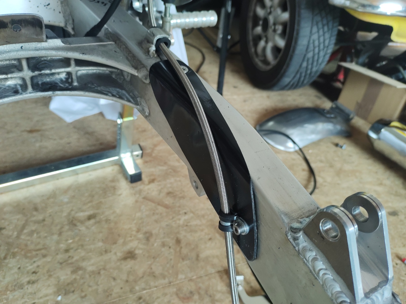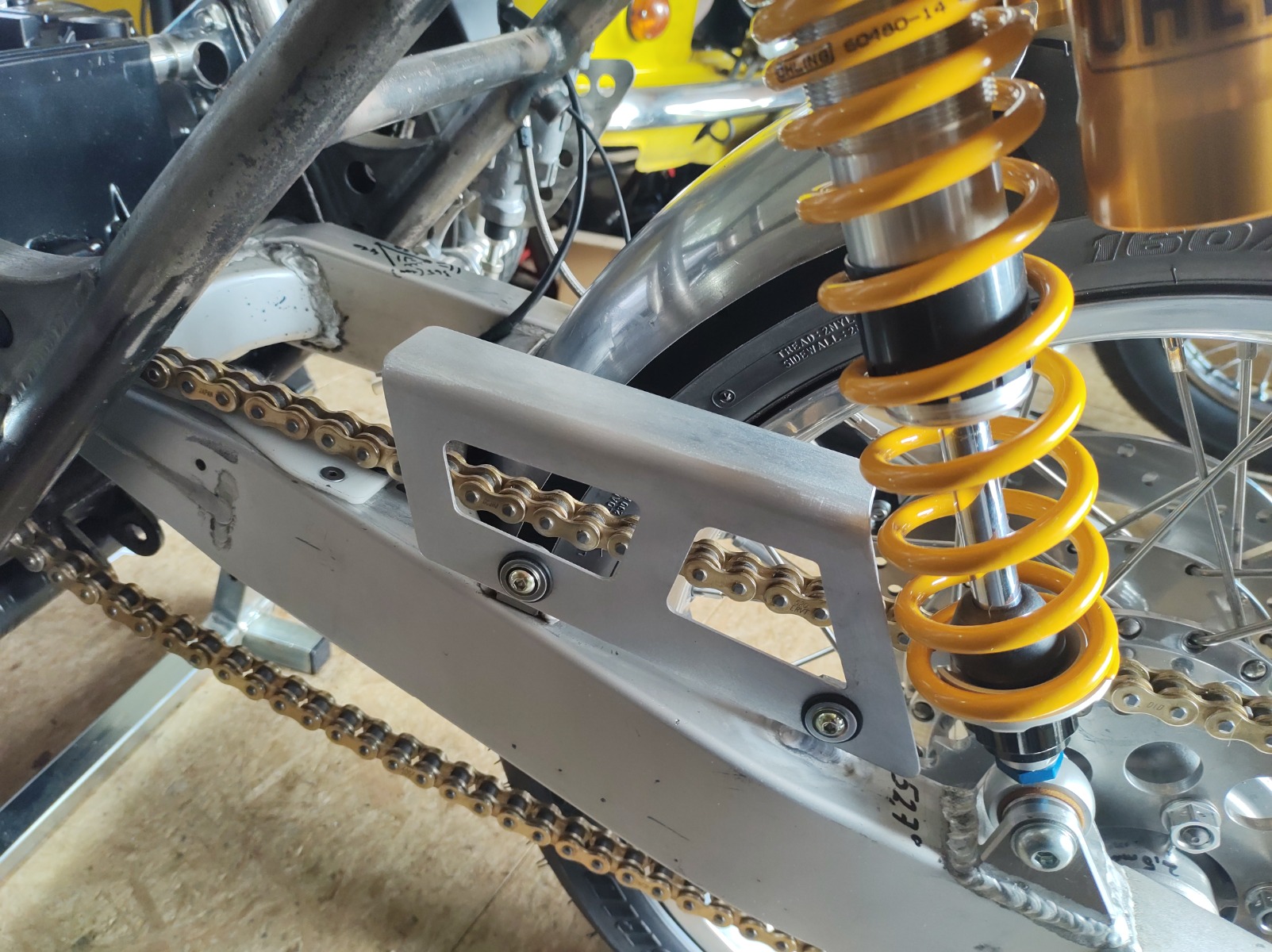 I got a chain guard from a local guy but it needed a bit of work, it was made for the stock shock angle. The guy I got it from did the welding - I would have definitely made a mess of it. Also made a guard for the brake line out of some PVC. It is just there to stop the braided line eating into the paint on the swingarm.
