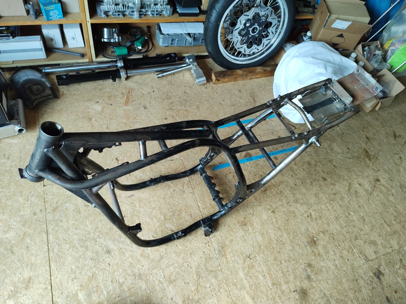 Finally got the countershaft sprocket and rear wheel aligned properly and then stripped the frame. I just need to redo the brackets for the tail section so it actually lines up with the tank and seat. After that it's time to start painting.