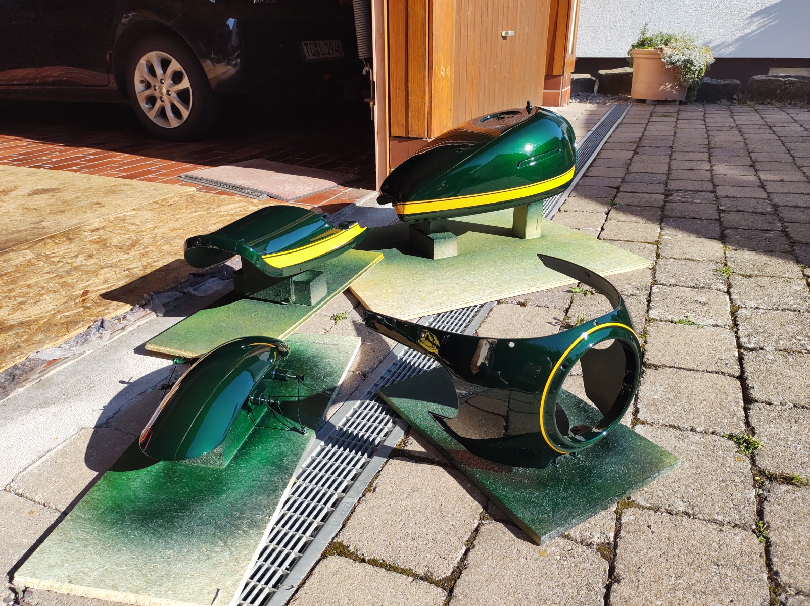 I went with diamond dark green and different stripes than originally planned. The trim is the same colour as the öhlins springs.