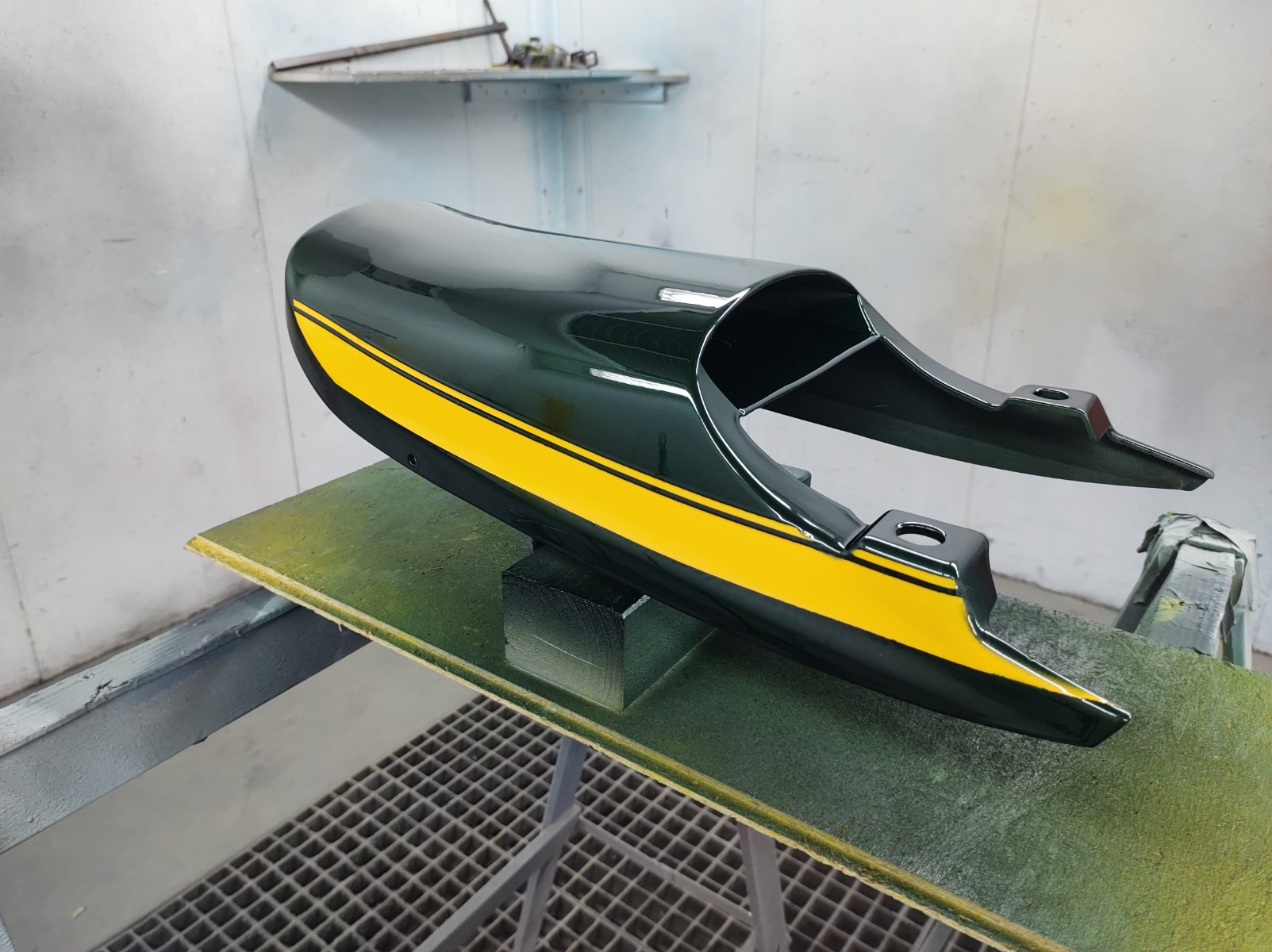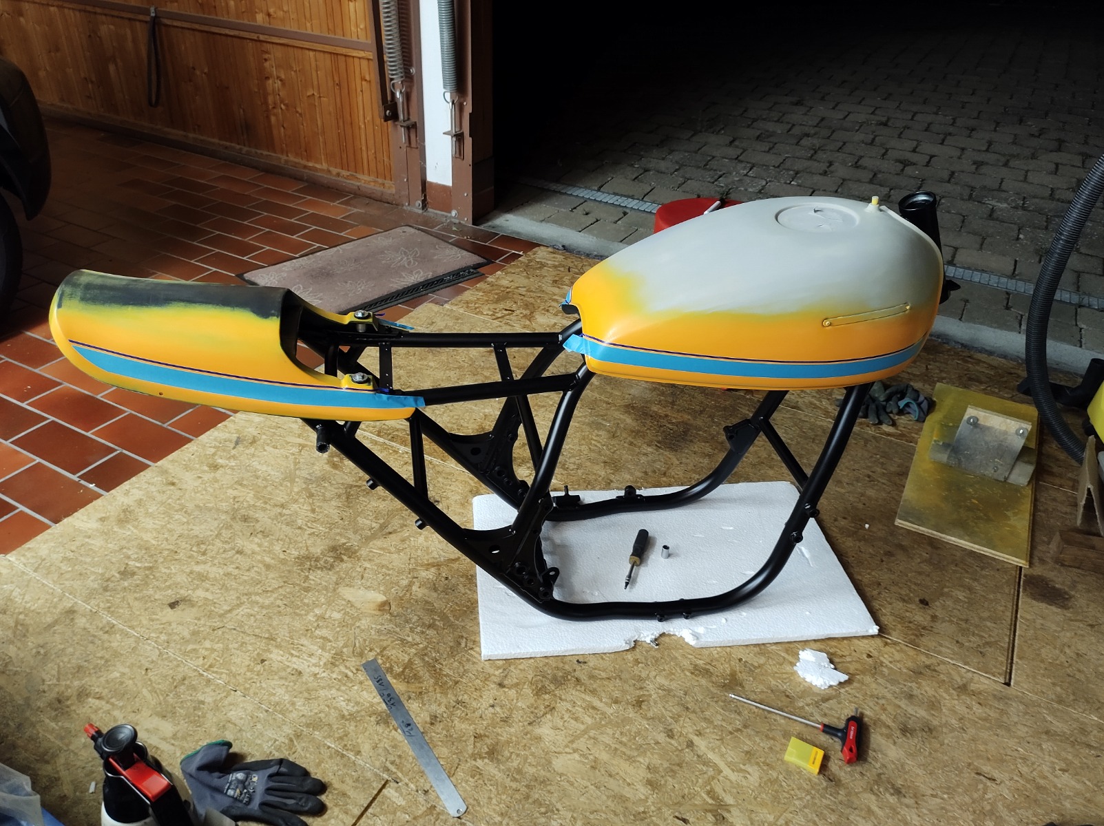 Did the underside of the fender and tank in the same black as the rest. put primer and some yellow for the pin-stripes on the top: