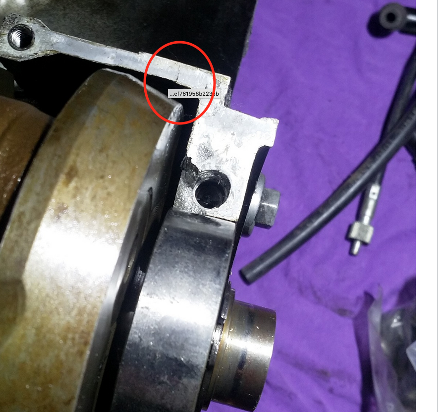 Here's the damage to the crankcase. Should be an easy fix, but even if it's not I still come out on top with the rest of the parts. I don't think I'll have to do anything with the mating surface, it should seal fine.