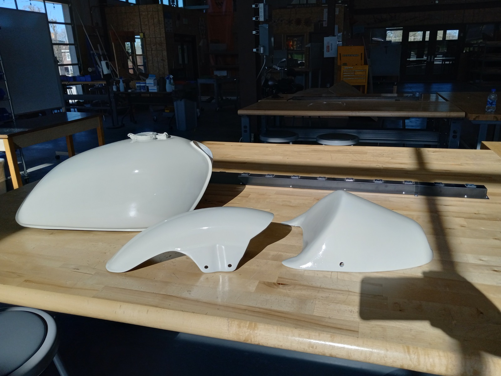 Also, I sprayed the first color on the tank, fender, and cowl. It's Chrysler Cool Vanilla, a color I like a lot that inexplicably only seems to show up on minivans.
