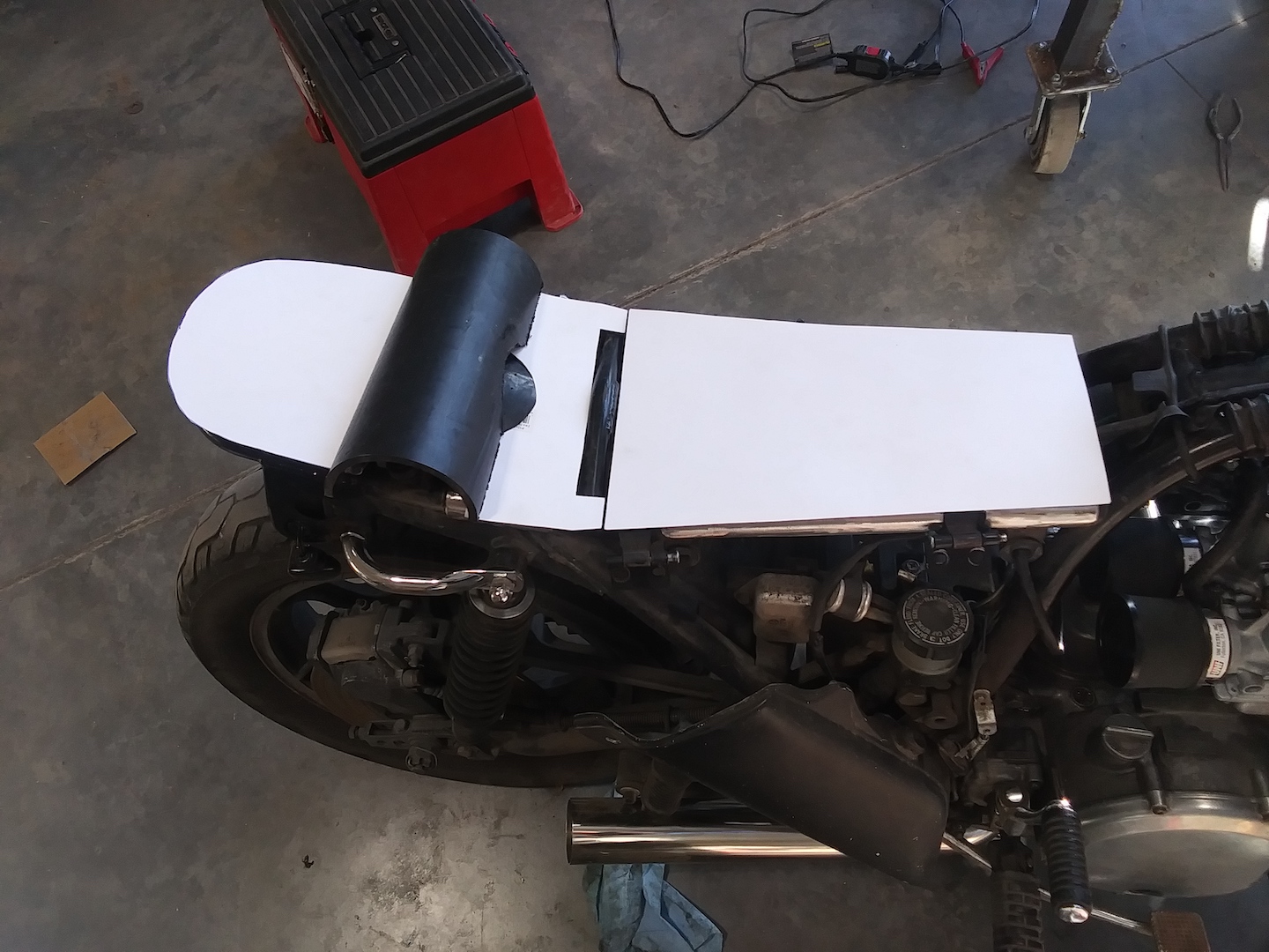 It's getting to be way more of a cafe racer aesthetic than I had originally intended; I'm no purist about that stuff (or much else), but I usually think bigger bikes tend to look a little odd cafe'd. Still, I gotta say, I'm pretty happy with how it's looking. I'm also happy knowing I can pull it off and put the old seat back on if the finished product underwhelms me. Moreover, even if I do like it, I'm likely to snap up an original fender and tail piece if they crop up, and I think it's kind of cool that, with minimal work, I could have a totally different looking bike on short notice.