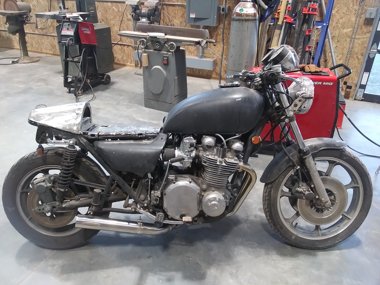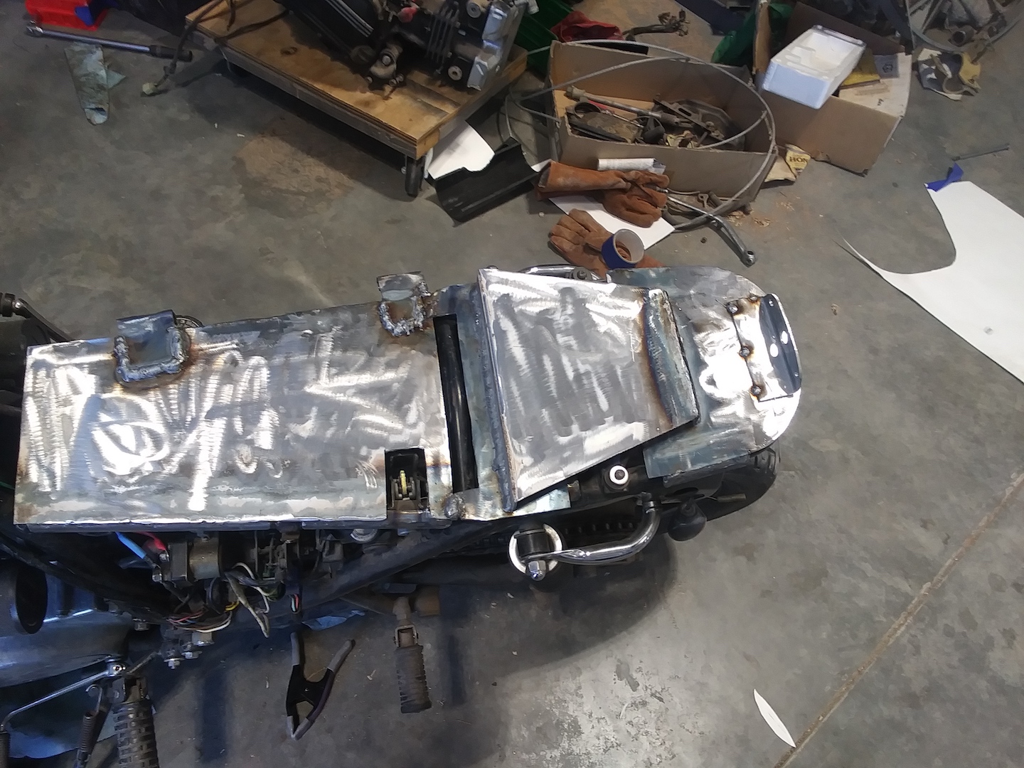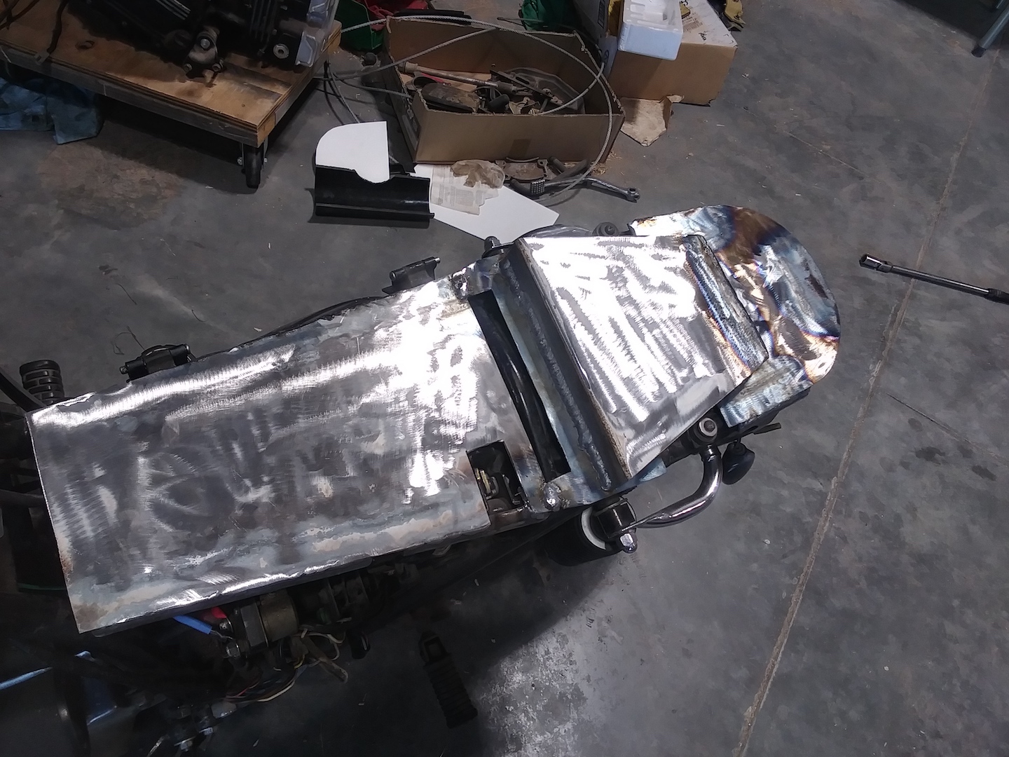 I formed it from a piece of thin steel I found in my backyard; I think it might have been a panel off of a defunct swamp cooler. It was thin enough to bend with main strength (I don't have a slip roll, an English wheel, or any cool stuff like that) and, really, too thin for my big mig welder. Unfortunately, I just discovered my little mig welder is in need of some attention before it's once more operational. The upshot was, a little welding and a ton of grinding. Still, I'm digging the look so far. I reckon I'll find an old camp mat (I know I've got several) and some upholstery—maybe an old leather jacket, if I can find a 2nd hand store that's open despite the pandemic.