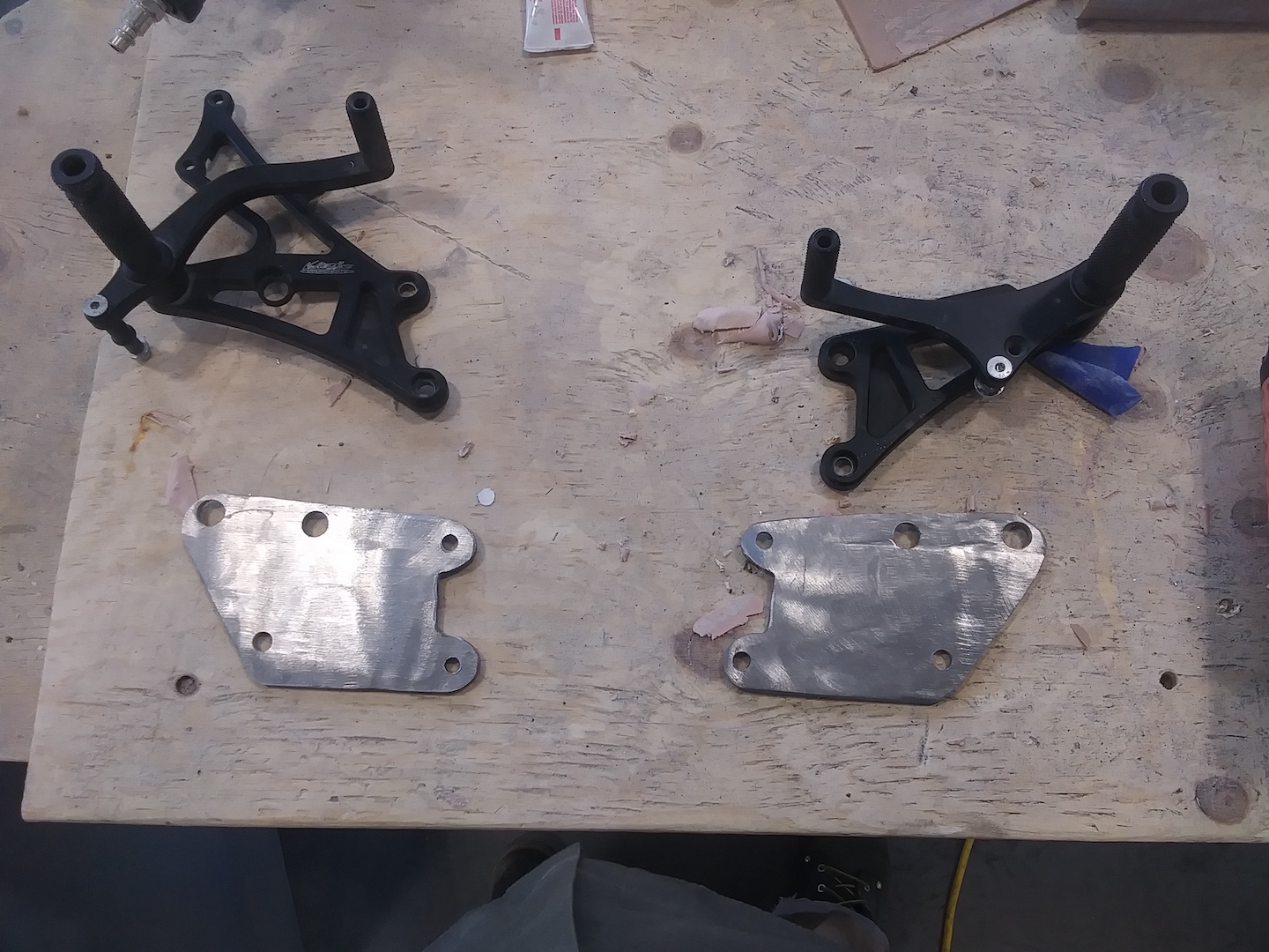 I've had this set of Valter Moto rearsets hanging around for years—somebody bought them new and decided he couldn't use them, so he put them on Ebay for $50. I bought them, figuring I'd find a use for them eventually. Here they are on the mounting plates: