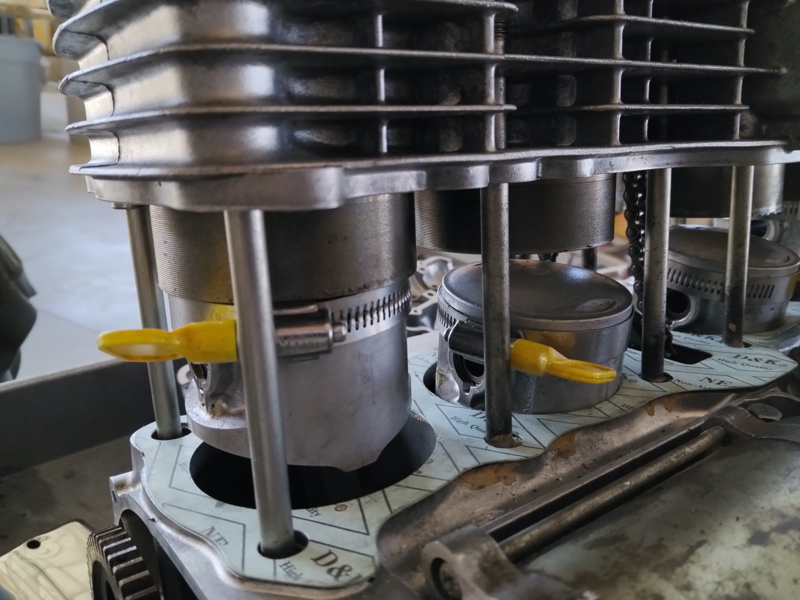 I decided, as long as I had it apart again, I might as well tart up the cylinder block with a little high temp paint and a bunch of sanding. Get a load of those jugs: