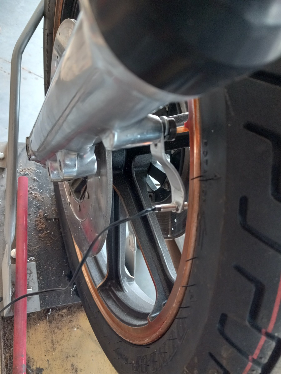 The magnetic reed switch that informs the Motoscope speedo needs to be mounted with a non-ferrous material, so I made this aluminum bracket