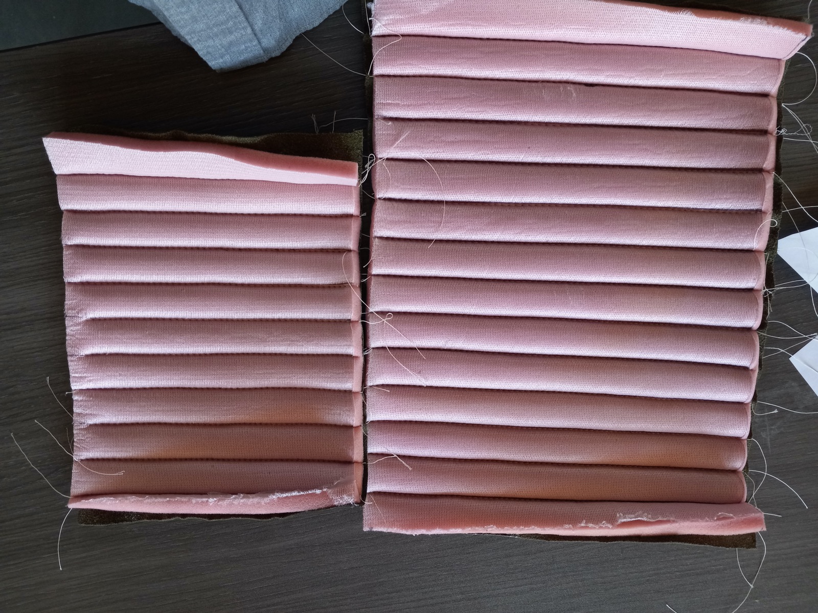 And I used the same adhesive to stick 1/2" fabric backed foam to the back of the seat top sections, then sewed pleats across them:
