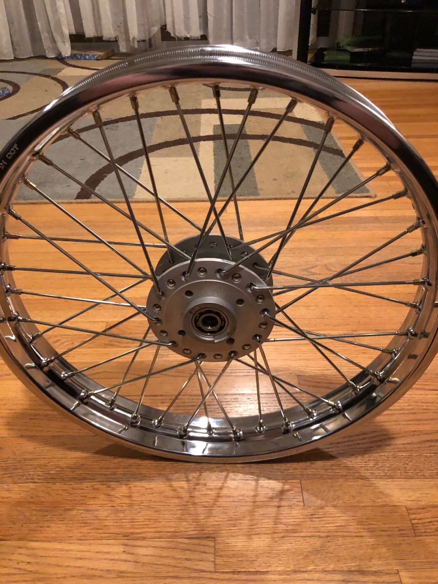 But, Parts clean, can work in living room. Front wheel assembled. New OE bearings, new DID rim, new spokes. Of course I messed up first time, but got it right (2 pics showing right/wrong)