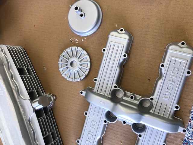 Painted engine cases. Cerakote instructions call for 5 days until final cure. I painted clutch cover (see in comparison to unpainted covers).Clutch cover is to be polished. I painted just so I can make some experiments on how it holds.