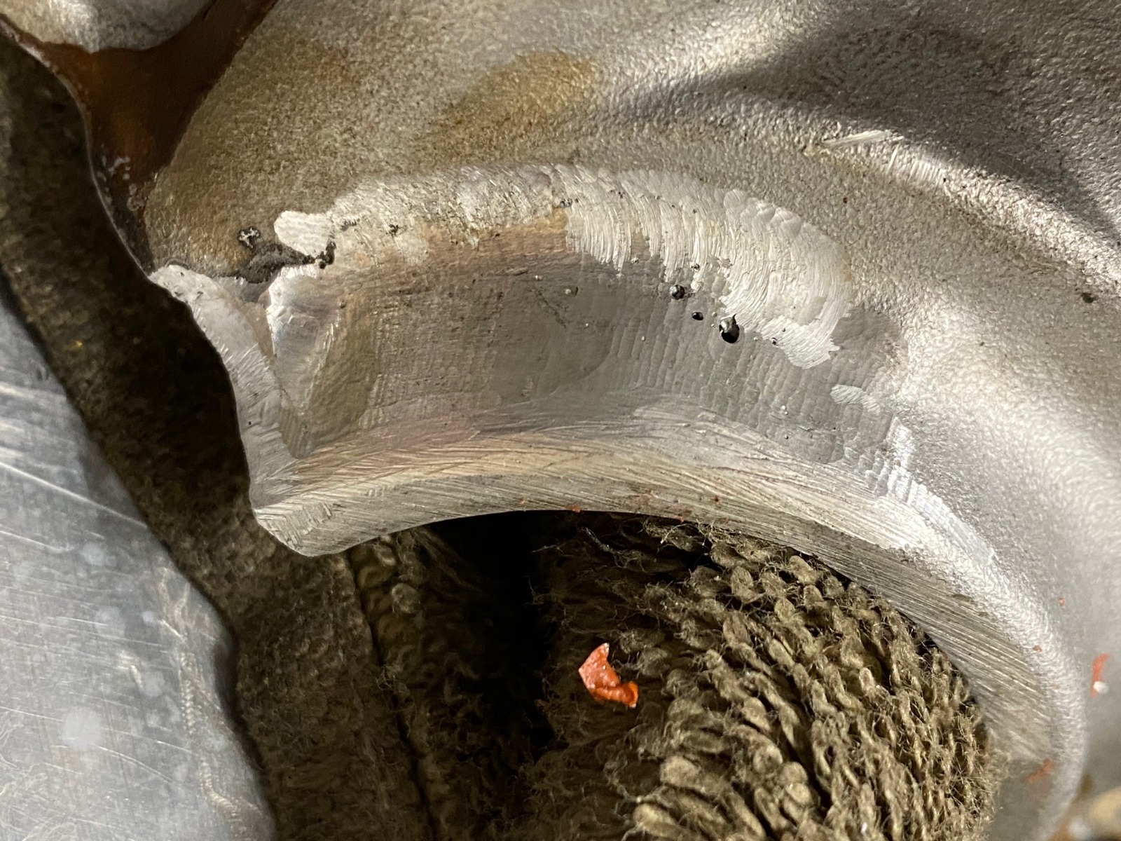 This photo shows the opposite side, where the case was welded and a crack remains on the flange.
