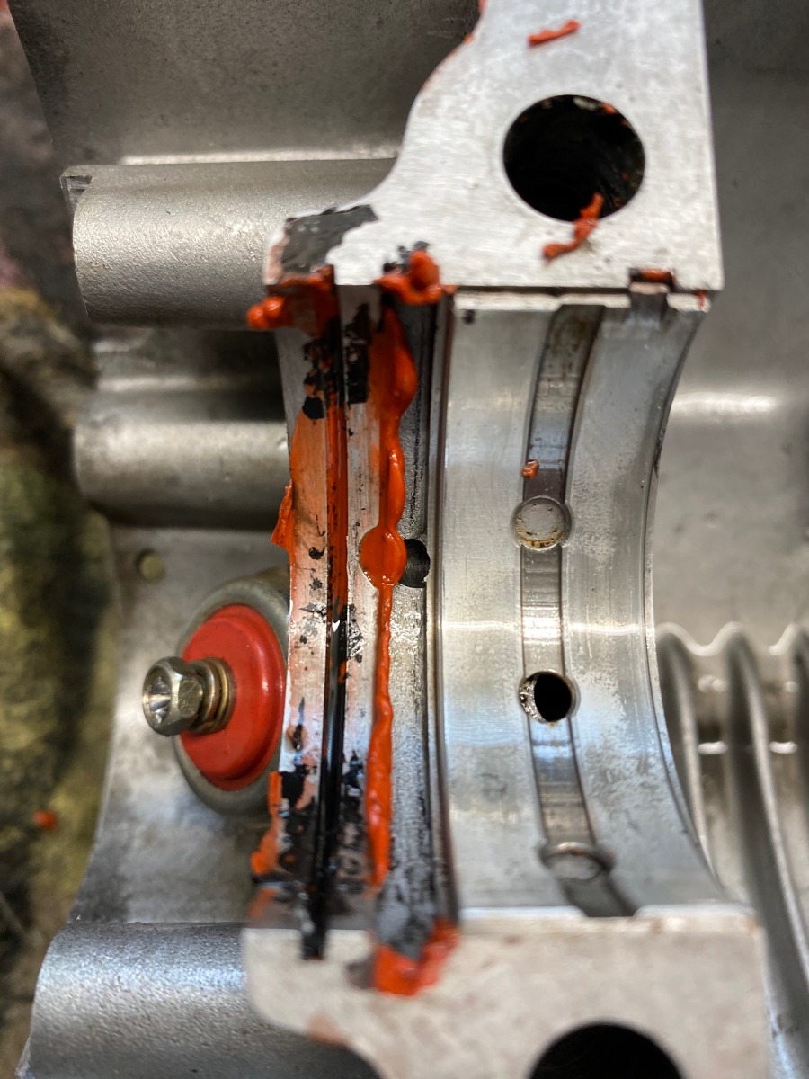 This photo shows the opposite side of the case to the first photo. Notice how the PO used permatex to help "seal" the end seal, but he used too much and the lube hole is partly obstructed.