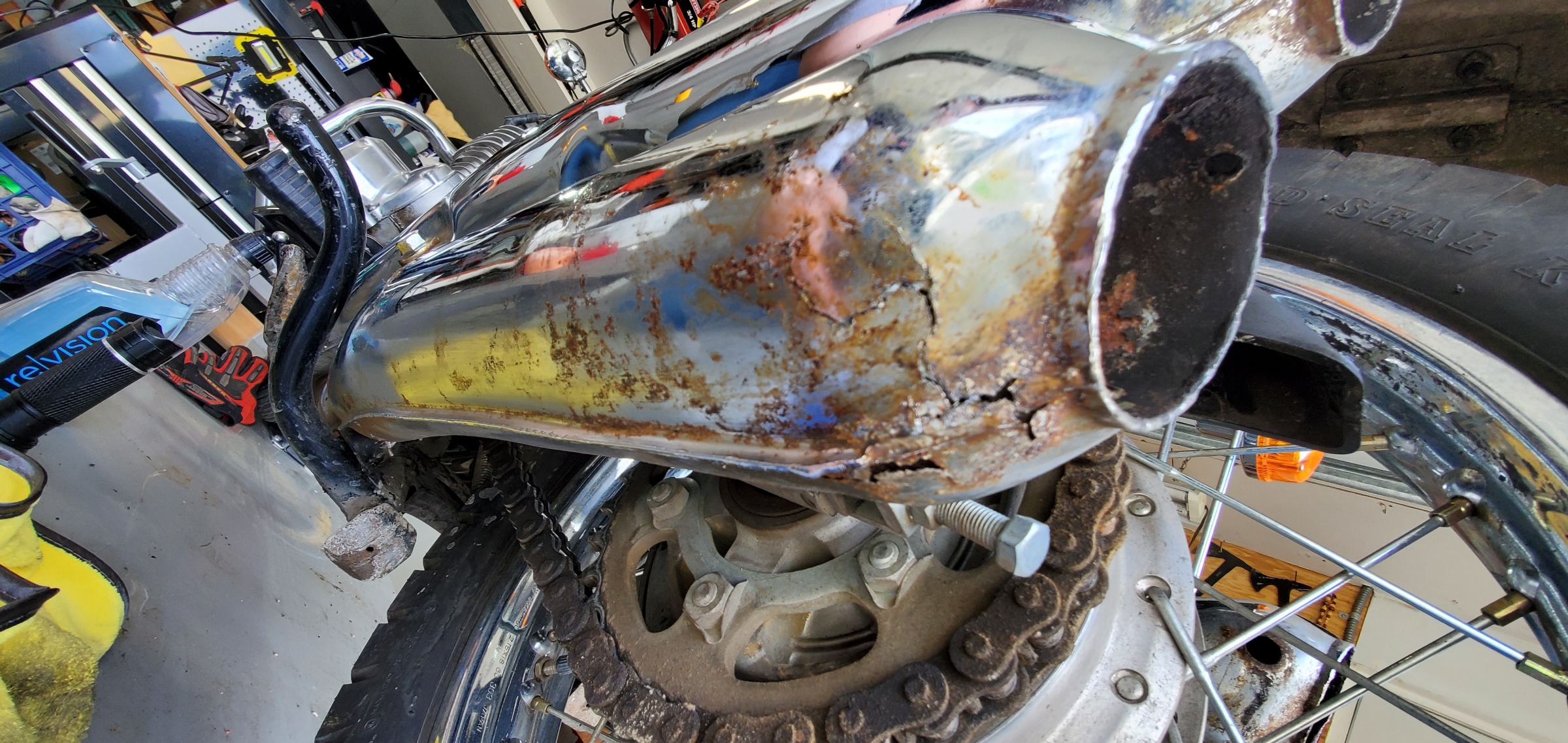 Beautiful bike! I hope you can source the two bottom mufflers. The bike is amazing! Even the headers are bright chrome; no discoloration from lean conditions. If you can get the new mufflers, and if needed, replace the silencers in the top ones. You can avoid any discoloration of the headers. Even the deer in the corner of the garage seems to be impressed, lol.