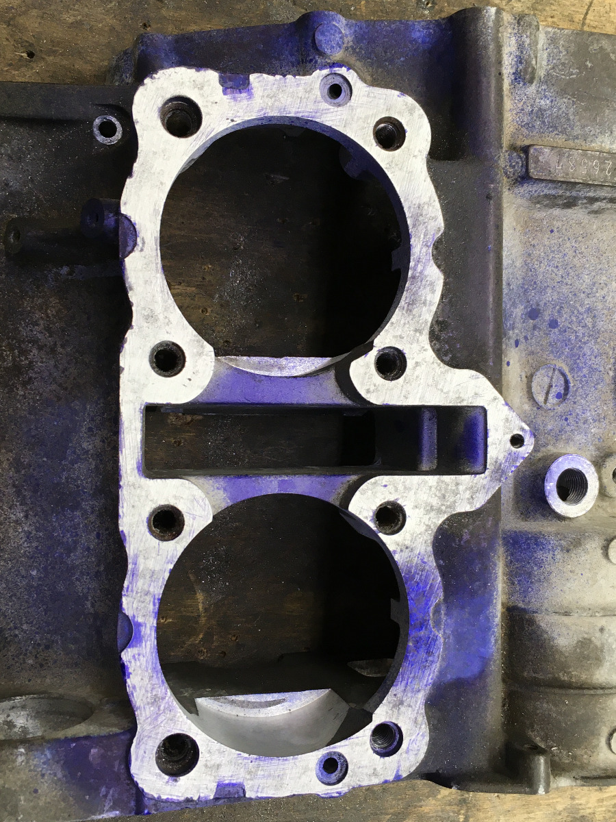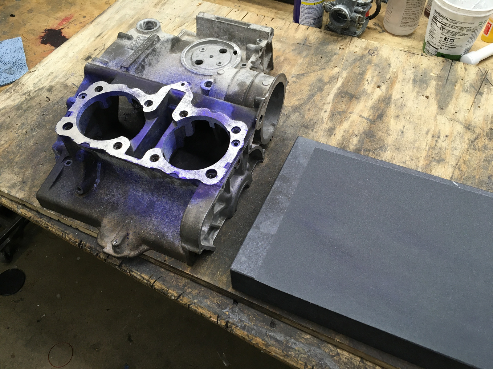 Whoever took off the cylinders before me did a number on the cylinder mating surface. There were some deep gouges from them prying off the cylinder. I wanted to make sure there were no high spots so I very lightly lapped this surface with some 220 grit on a surface plate. this revealed a low spot and a little more lapping removed it.