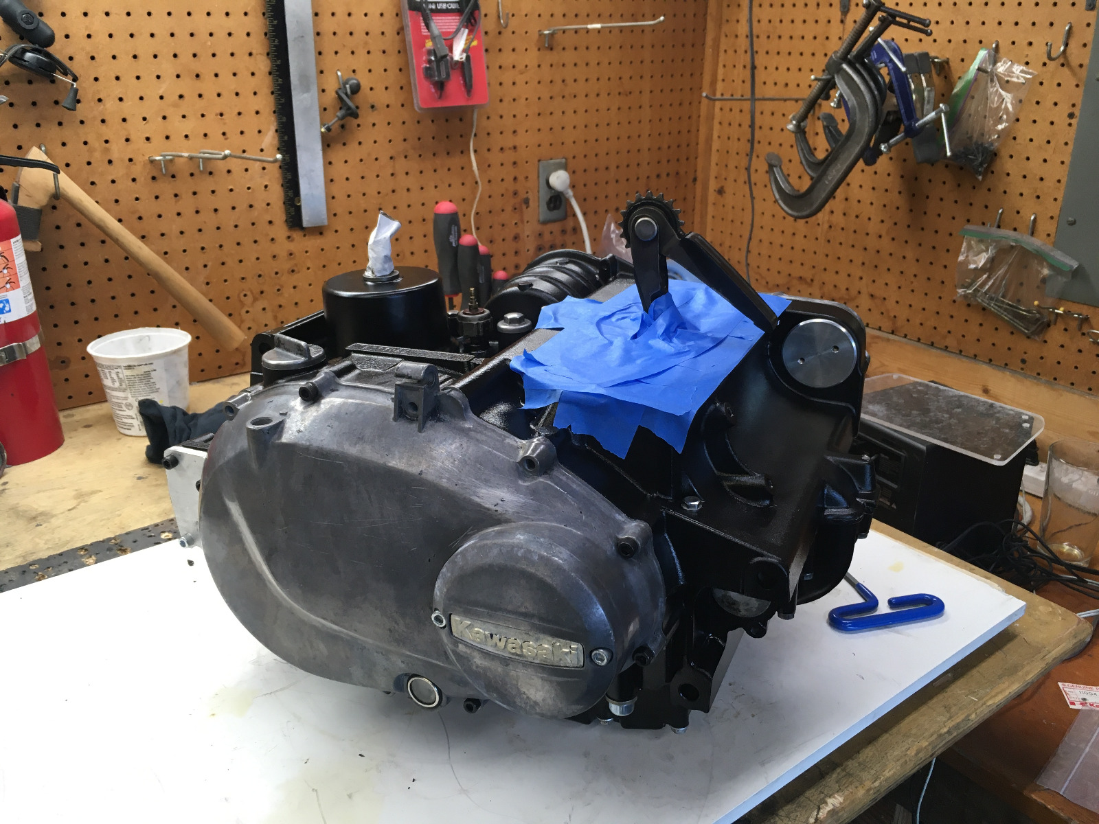 Clutch - Basket from 83 twin - this clutch basket is aluminum saving over a pound in rotational mass, it also actuates from the right side of the engine allowing a much larger output shaft sprocket. Stock clutch disks with 20% stiffer springs from a Ninja 650.
