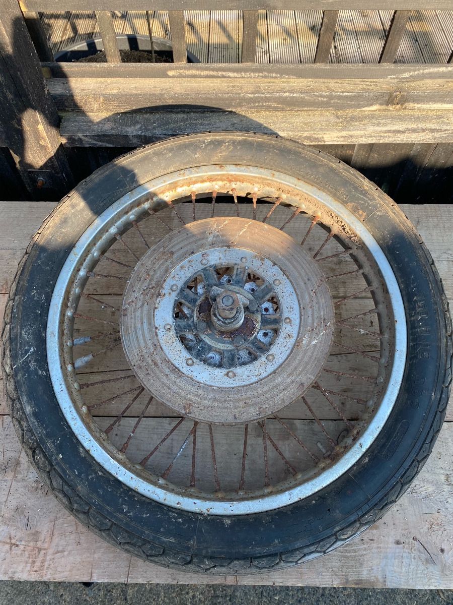 If anyone wants to throw any eye on some of these parts to clarify what years and models they are from i would be real grateful. Im fairly sure the aluminium 3.50 rear rim is off a Kz1000 Csr.. and the original 19" wheel is there but the second wheel has twin disk and the forks have twin caliper mounts and are 75.5cm from the axle canter to the top of the fork.