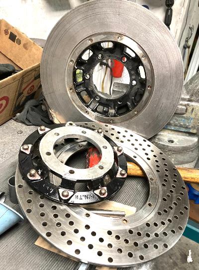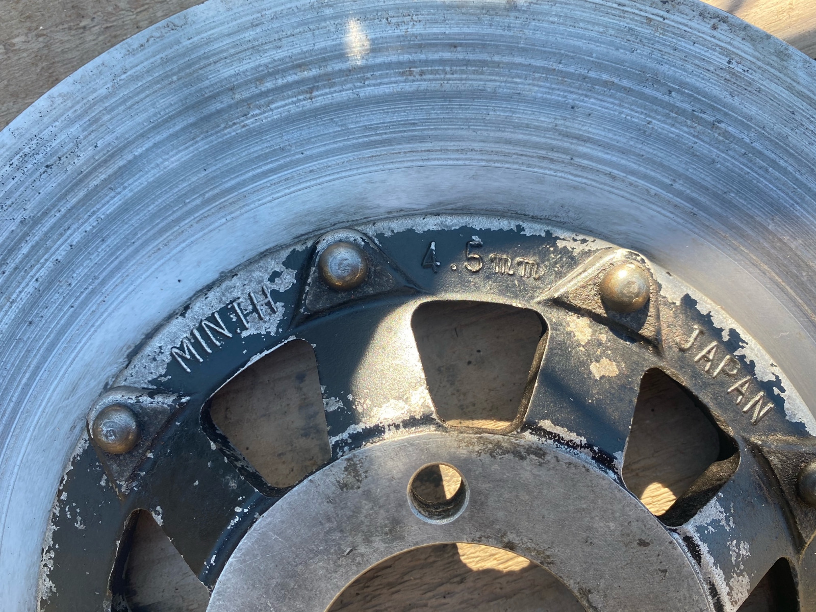 And way back, I ruined a set of OEM Z1R front disc's on purpose! I countersunk the 4 mounting bolt holes to 45° so I could use flat head machine screws. To match that theme. This thing is still sitting.