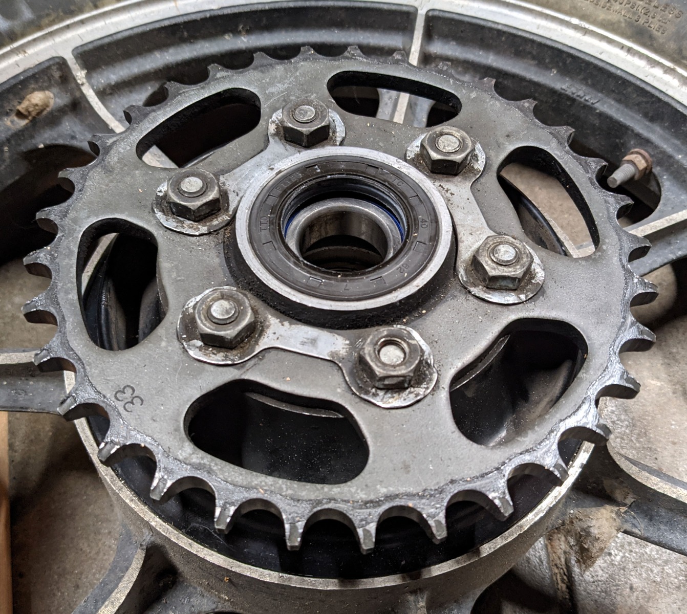 The other thing I’ll mention is that those dog-bone lock-tabs are really a big pain in the neck. The tabs were bent up on 2 sides of each nut. That’s 16 tabs to bend flat and then bend back up for new sprocket. It took forever. I’m guessing they went to flange or lock nuts not longer after ‘78? If so maybe I should switch to those newer fasteners next time.