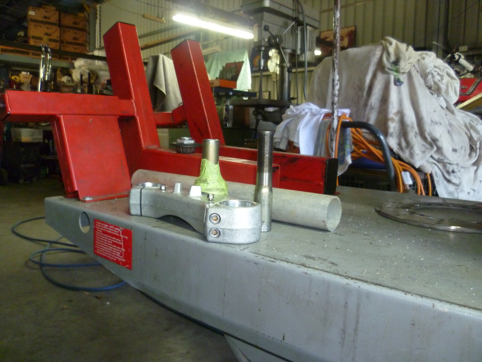 I have to lengthen the steering stem 10mm, it almost fit without alteration but anyway, I didn't want to remove the bottom clamp to cut the stem so we put it in the lathe an, we then realised that it couldn't be cut because the bottom clamp was in the way, so I suggested a pipe cutter, so we put the lathe on its slowest speed and used the pipe cutter to cut the stem in half, It also left a nice beveled edge for welding...