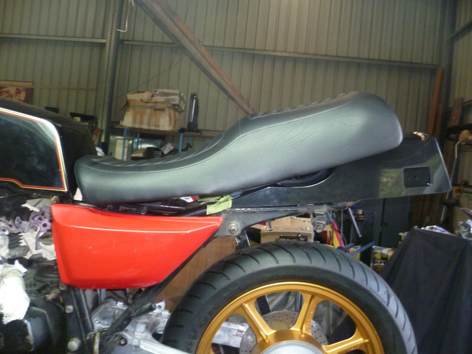 Above is pics of the bodywork on using the R1 seat, you can see there needs to be a bit of work to make it all fit, the Z1R tank is a bit shorter than the R1 tank, so the seat mounts will have to be moved forward, I have stripped the seat down to the bare pan, the R1 seat is about 20mm too wide, so I plan on cutting a section out full length on both sides and have it plastic welded back together, It will be a bit tricky but it will work. The KZ1000MKII tail I'm using is not as wide as the R1 tailpiece and the Z1R tank is also narrower. I'll have to do some surgery on the tailpiece too, the seat rubbers that sit on the frame hit the side pieces but again, it should be an easy fix...