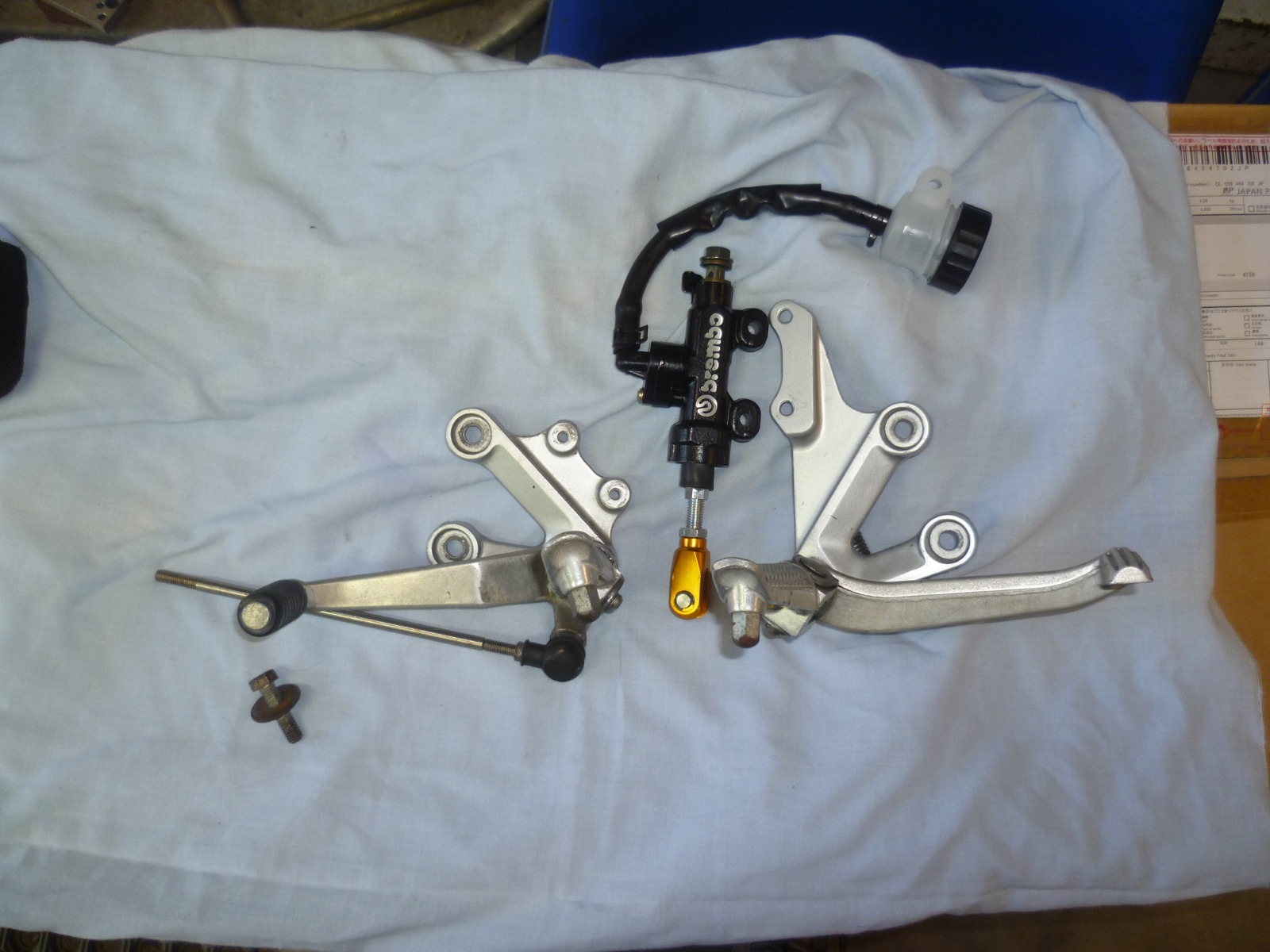 Went through the parts stash and pulled out some more parts I'll be using. I have a nice billet underslung brake caliper mount that has been paired up with a Caliper I bought online, If you look hard enough you'd be amazed what you can find. The caliper is 6061 T6 Aluminum, all pistons pads and seals are the same as the Brembo P234 super sport calipers, actually, its a direct copy, only the bolts differ, the P234 calipers sell for around $700 dollars here in Australia.I also have a "brembo" master cylinder to match. I also found a set of rear sets I've had stashed away for over 20 years, can't remember what they are off but I remember buying them because they were basically symmetrical. I threw the calpier and mount on just for a look.