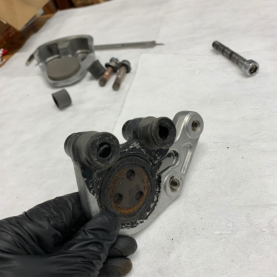 First I bead blasted as much as I could. The PO had put lots of paint over the corrosion. Then I pumped the piston out. Fluid looked like mud. Lots of work to do here. I was going to dual disc it but I decided to keep it single. I’ll rebuild the MC and caliper. I have to get a repro disc because again, the PO got rid of the original disc.