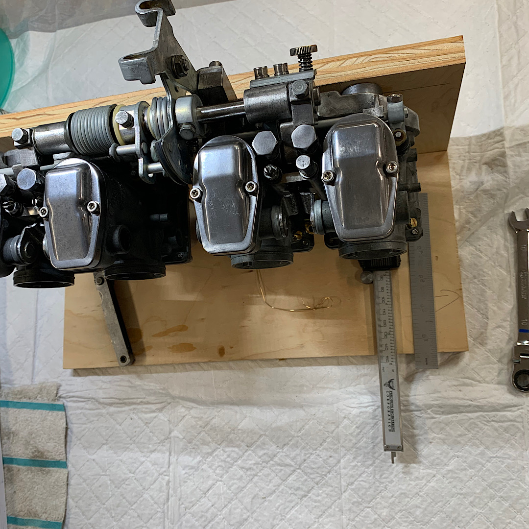 31 Jul 2021 06:58The carbs will come off again after I run it and then take it apart. Right now I am bench synchronizing them and my shop manual is not like my carbs. The initial setting of the slides requires a .6 to .7 mm space between the notch in the bottom of the slide and the throat. It implies I can adjust all 4 carbs this way. I seem to have a set where the number 4 carb is a fixed setting and the others are adjusted (initially) to match. I included a photo or two. You can see that number 4 has no adjustment screw. The gap under the slide is fixed and is about .5mm. I do not have a drill bit that small but I do have my wife’s silver and gold filled wire. I got a piece and carefully flattened it to make a go gauge. All 4 set now, next step is clear tube check for which I made a little stand.