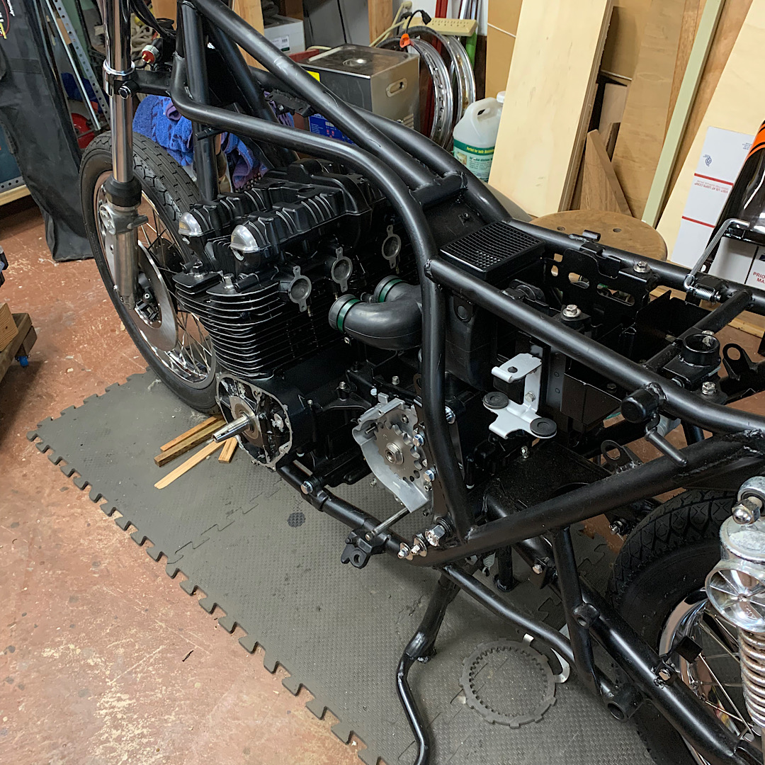 The frame is thicker and I'm adding gussets to stiffen up the frame. Went with a 98 KZP swing arm that is 1 1/2" longer and stronger than stock. NO MORE WOBBLES.