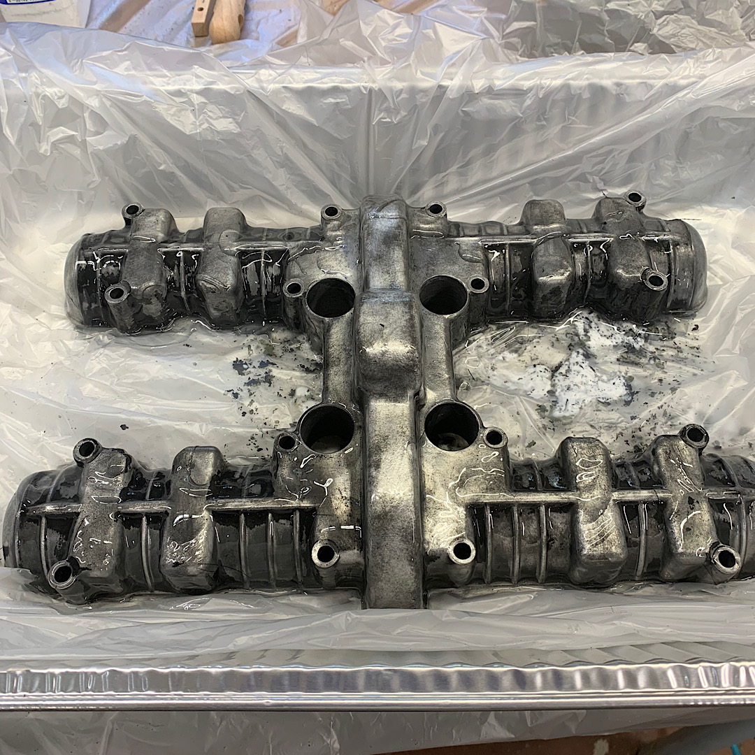 No one vapor hones here (business opportunity for someone) but I may fab up some good blanks, seal them to the engine parts, plug all the threaded holes and have someone use some glass beads or something to get all the very bad paint off it. I’m thinking of VHT black for the engine. Of course I’ll buff off the edges of the sides and front of the fins. I may try spraying some hi temp clear on the edges to slow down the corrosion of the exposed metal, it’s a big deal here. I wash my stuff with a deionizer (CR Spotless) which helps wash salt spray away. The frame will be gloss POR 15. I’m not a fan of gloss frames but Marsdens book says the frame needs to be gloss.