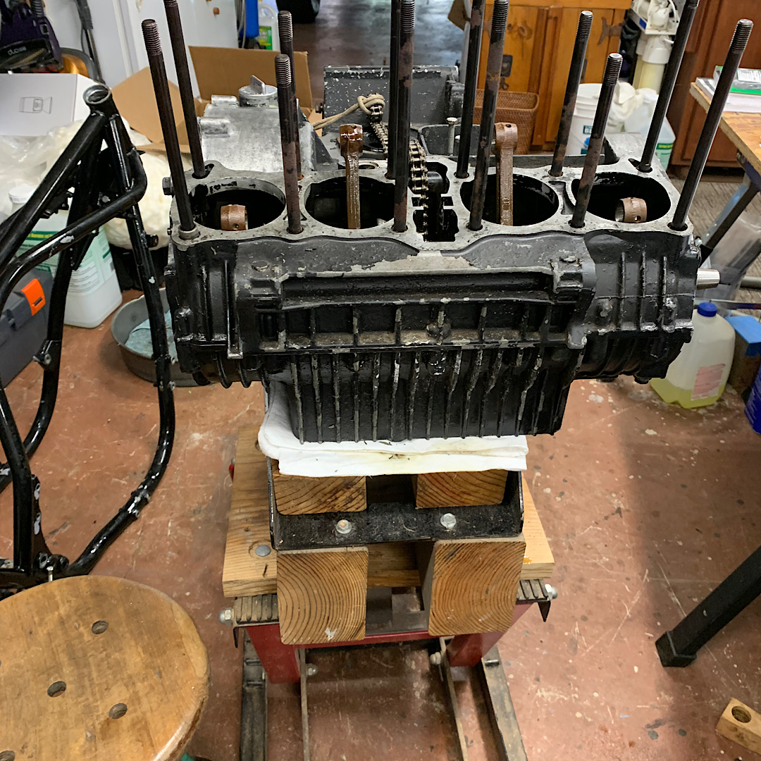 A bit of good news, the engine fits my CB750 engine stand, now I don’t have to wrestle it so much. I can roll it around and even flip it if needed.