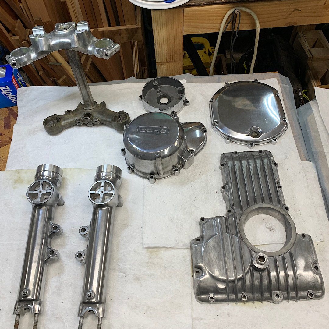 I’ve decided that the fork lowers need to be returned to a brush look instead of the pocked look. To that end I ordered a 1” x 42” bench top belt sander and a belt package that goes up to 1000 grit. This should get me there and they will look right, that pocked surface just doesn’t look right.