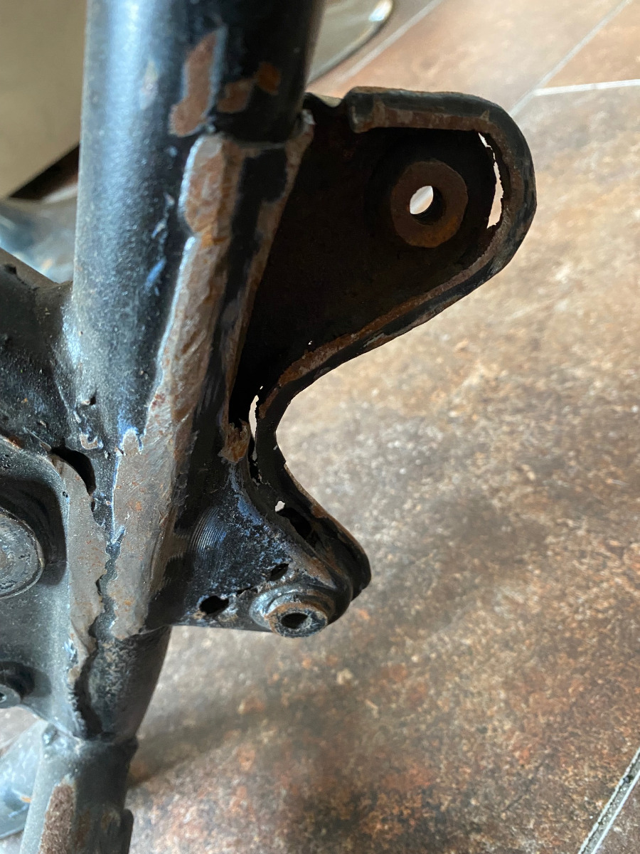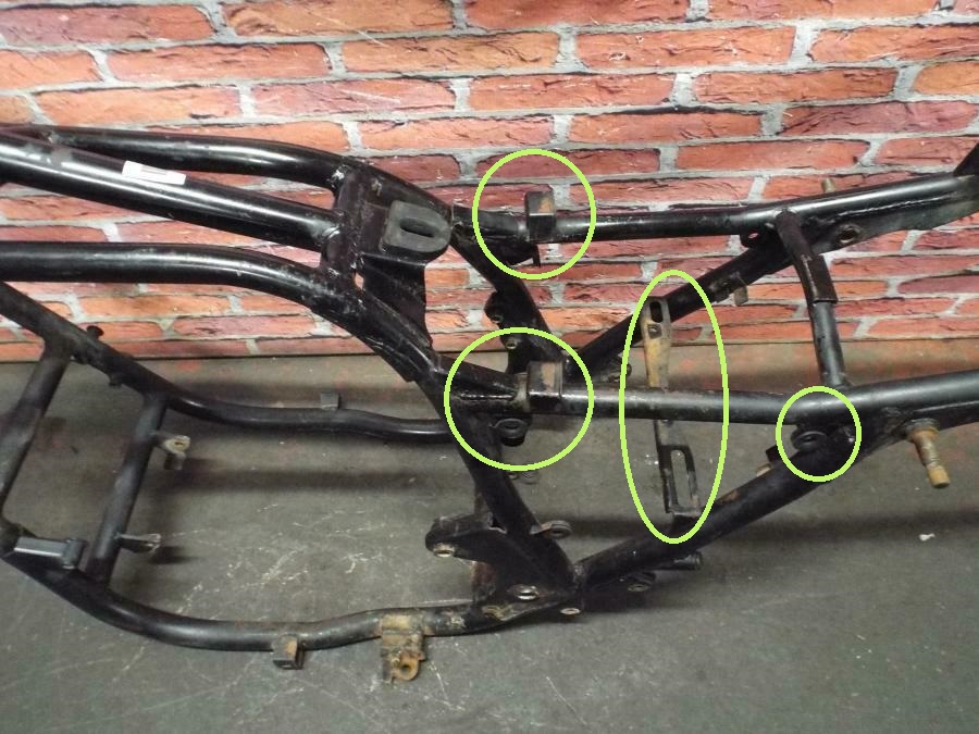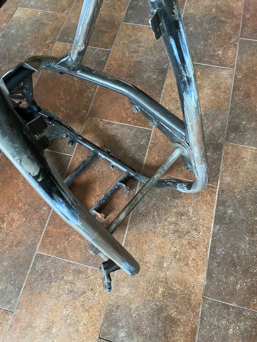 I bought this frame about a year ago maybe less, it was small money and came with a title both rare things round here. P.O kinda butchered it up to build a mono shock but thank the Gods he didnt cut off the shock mounts but shaved everything off that mattered. There is some rust wear on the rear mounts but they were cut up bad too so they will have to go too. I'm looking to try and bring it back to a shade of original or as close as i can with what i can fabricate. Where it goes from there... who knows but the title says the bike is green...so that might mean only one thing.