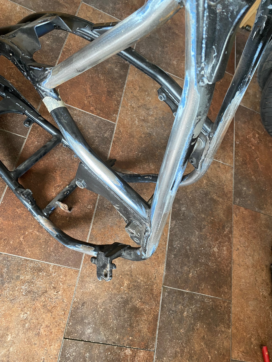 Few well spent hrs and the frame is clean of all rotten and non wanted additions. I kept most of the weld on the upper frame rail, i just blended it in, it will help keep strength there cause who knows how much meat was ground away by P.O. Ill jump on C.A.D and design new mounts when i get a chance.