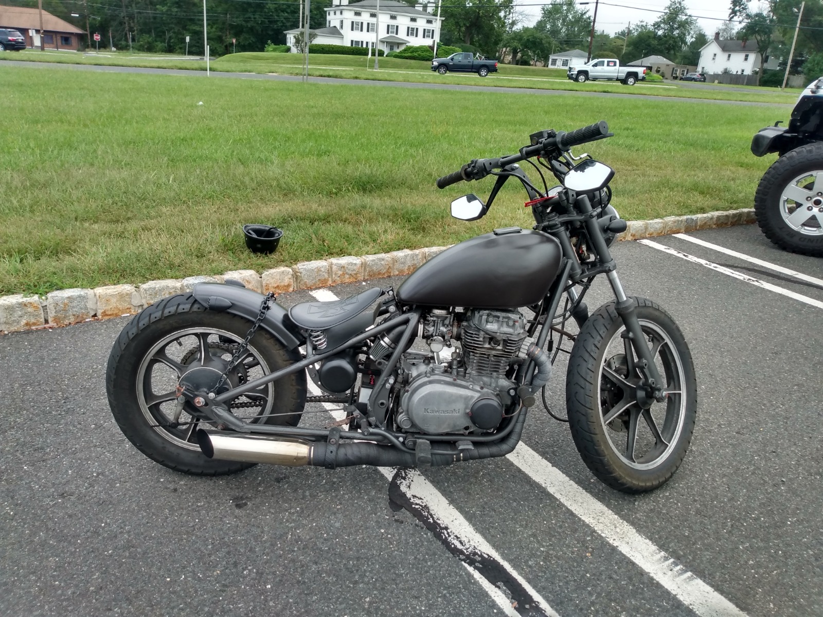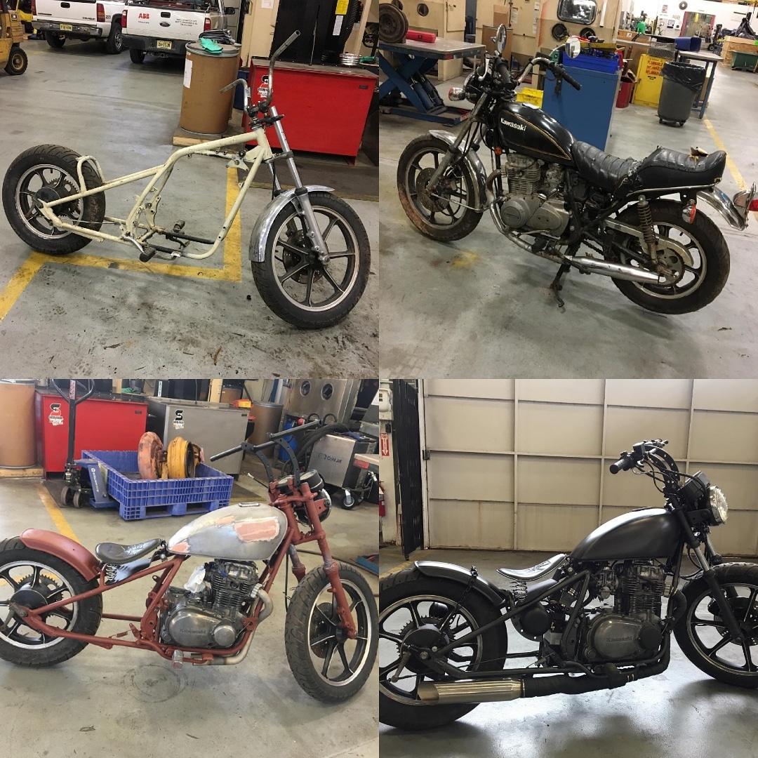 Hey guys, I have not been on in a long time, but just wanted to get an opinion on how my project came out. I built this bobber from 2 bikes. I used the front half of a 79' KZ400 frame, fabricated a 6" stretched rigid back half, fabricated handle bars, fabricated complete 2 to 1 straight pipe exhaust, fabricated false oil tank for electronics under the seat along with alot of other custom fab work. Bought an 81' LTD 440 and used the engine, gauges, wheels, headlight bucket which I retro fit an LED jeep headlight into. Made custom 45° pipes to mount the pod filters. Jetting this bike in was quite the task with the straight pipes and pods, but got her dialed in and she runs like a champ. I love seeing other customs, so post up a pic of yours and leave some feedback on mine.