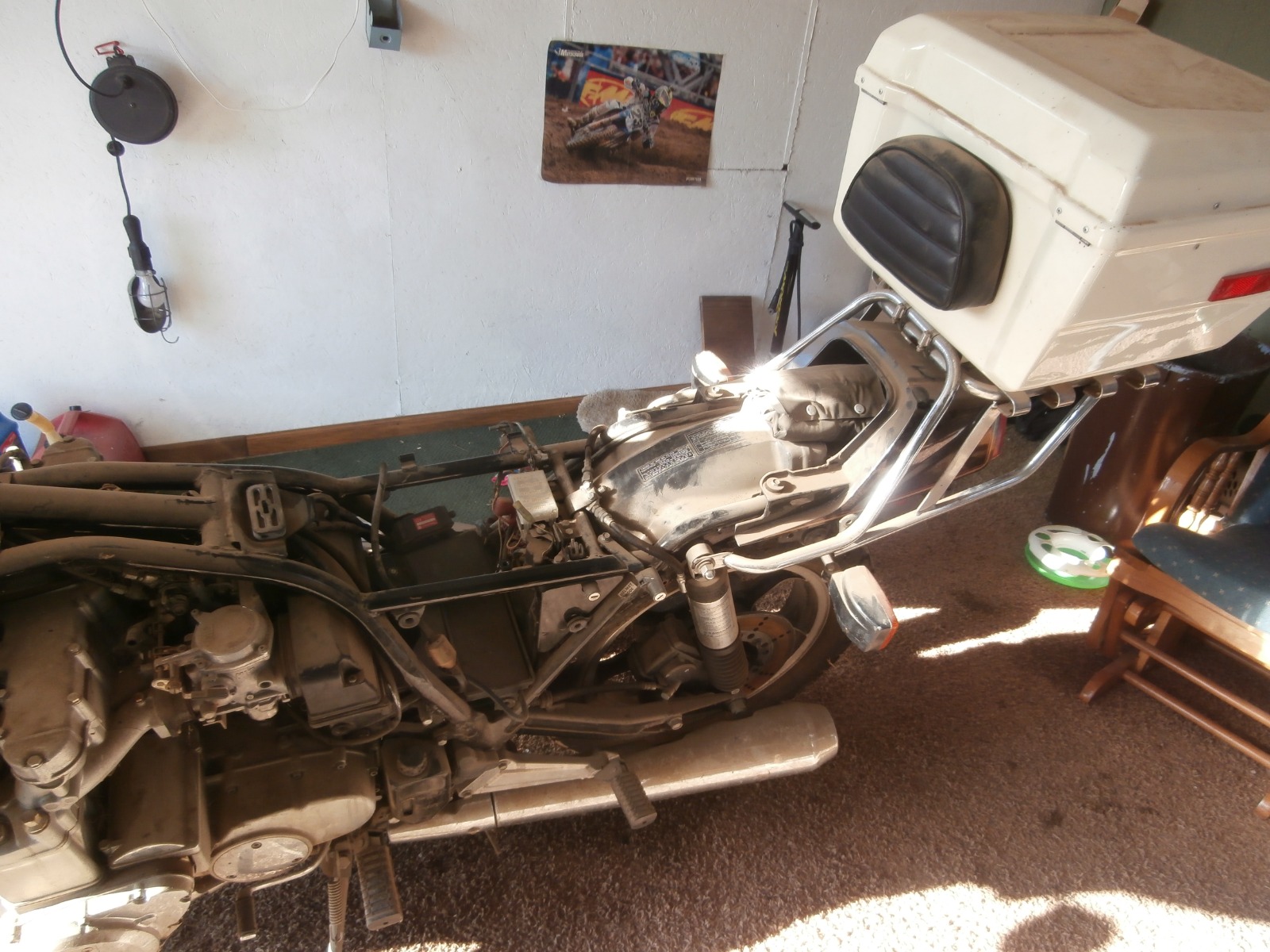 I had stuck my neck out since I wound up spending much more money on the 1100 than anticipated, but I got it roadworthy, had fun doing it, and learned a lot. Come early spring, I took delivery of the 13. I took a good chunk of summer off riding, maintaining my other girls, and tuning my son's Ninja, but finally took 'Mad Max' on his first ride three days ago. The 'before pics', which are obvious, is exactly how she looked on delivery into my shop with rear air box off and electrical components hanging out the right side. At least he had the courtesy of draining the carbs before he parked it which is more than I can say of the 1100 which was a mess. The first thing I did was get a bucket of water and sponge and removed some dirt so that I could see what I was doing.