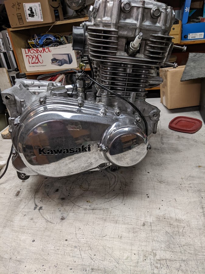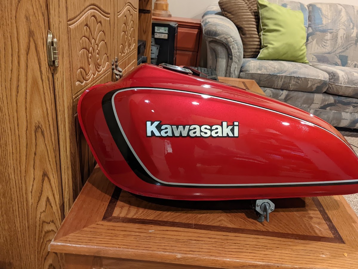 The bike is now sitting in my basement rec-room. Mostly assembled. I am still waiting for a correct Tach to come in and a KAWASKI Fork cover emblem to come in. Once that is done, I will disassemble the bike and carry all the parts upstairs into my garage for final assembly.