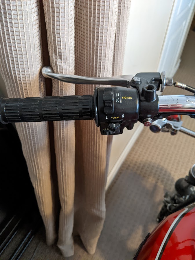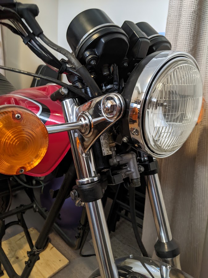 All chrome parts polished and waxed until I can find better ones. Gauges cleaned and painted. New grips installed.