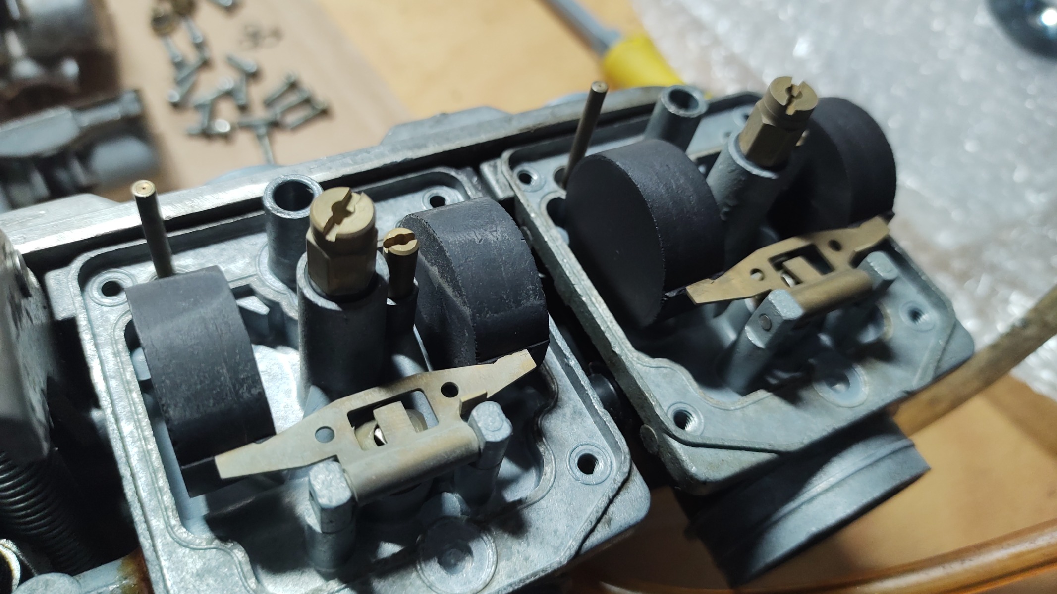 Tore everything down today so I can take the parts to get zinc plated. Look to be in pretty good nick. One of the sliders is stuck so I'm soaking that at the moment. The choke plungers and jets look OK to just put straight back in after a clean - jets are 107.5 and 15. The float valves have a bit of wear and the main shaft has some pitting. I'll replace the valves and just make sure the shaft is well lubricated.