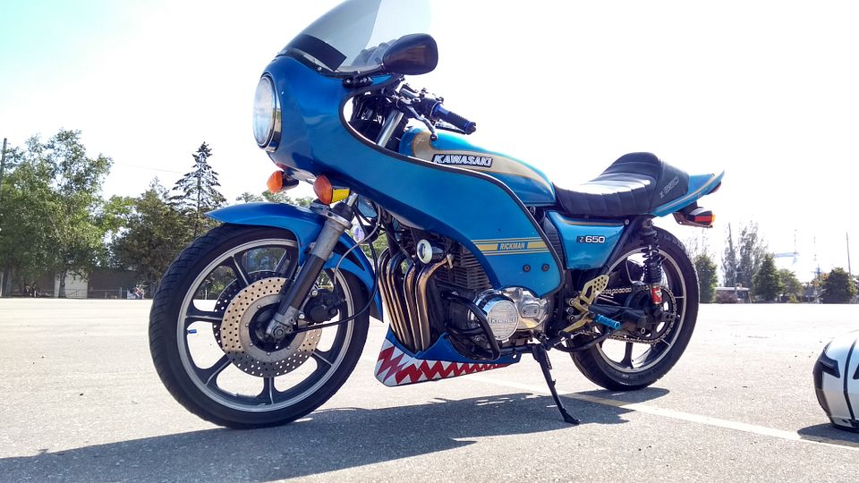 1978 KZ650 C2, 130K kms, Delkevic ex, EI, CVK32, PMC easy clutch, ATK fork brace, steering damper, braced swingarm, ZRX shocks, 18" Z1R front wheel.