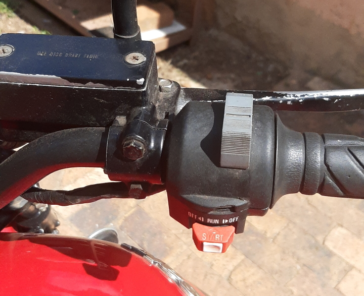 Handlebar controls are a bit sun-beaten, but they will clean up ok, I guess. The RH control has a chip out of the plastic, so I'll see about repairing that with Cyanao baking soda, and a coat of paint.