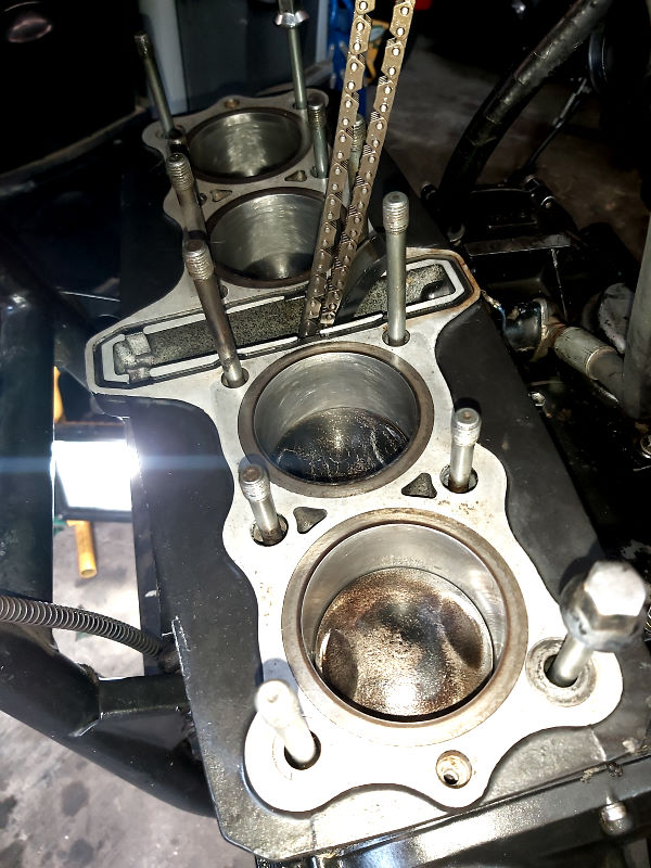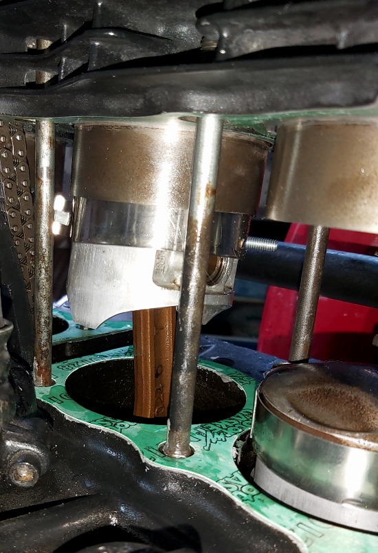 I lubed the bores with fresh engine oil, then fed the cam-chain up through the centre and tied it up to the frame with some wire...