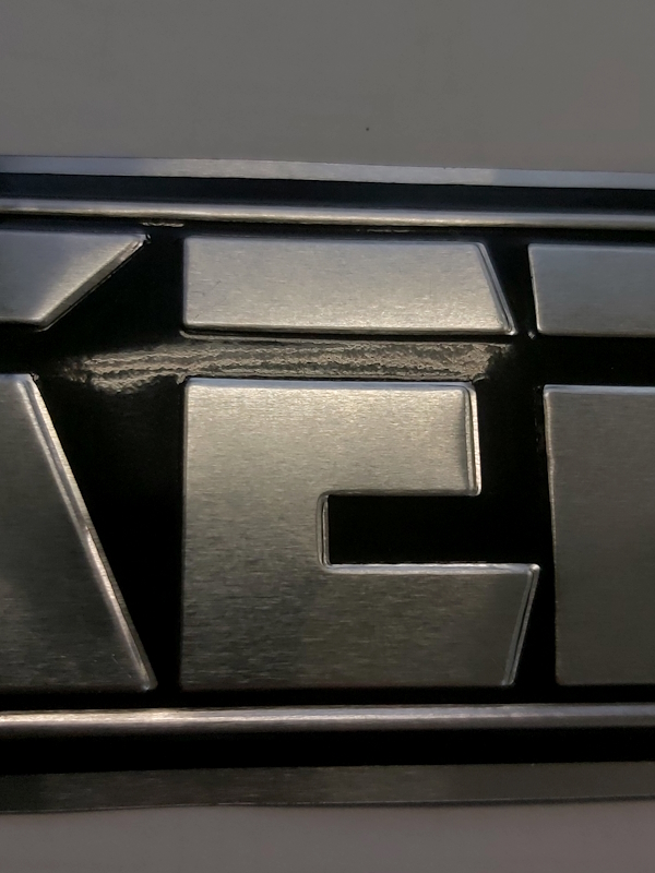 I had a local decal company cut a "mask" from "peel and stick" vinyl so that I could spray paint the black areas of the badge, which, when the mask is removed, would leave the shiny aluminium letters exposed...