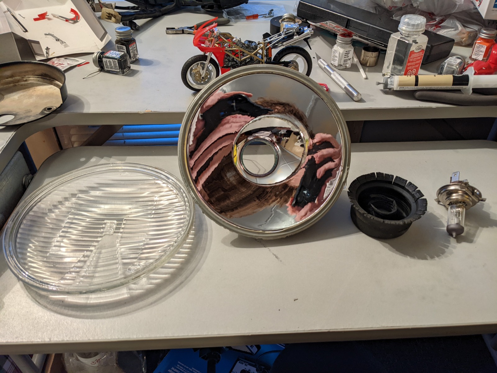 Old headlight was spiderwebbed with cracks and when I took my other one out of my Windjammer the glass popped off. I think I'm becoming an epoxy person... here's hoping I don't start putting RTV on everything too.