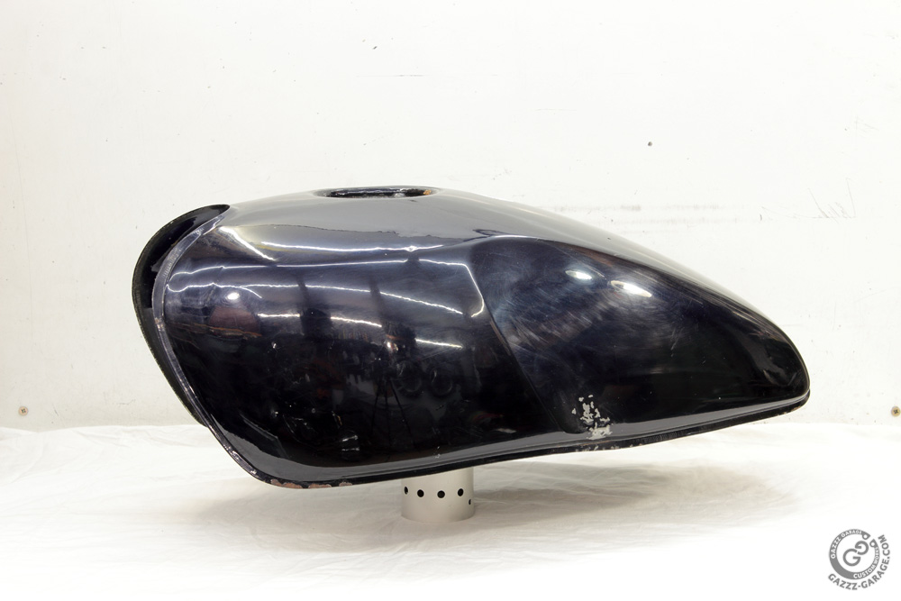 Well, it turned out that time is more pressing than I thought. So instead of putting another couple of posts about the project I am forced to jump right to its latest page. At some point I and Oksana decided to go further with the Zephyr 550/400 project and make modified Zephyr as we see it. However, I couldn't repaint the tank and side covers of the Zephyr 400 that stands in my workshop since it's not mine. So I bought a spare tank for this purpose. Photos on ebay-kleinanzeigen showed that it had some dents, but the price was fair and the seller was easy to reach by email, so I wrote to him and bought the tank with direct delivery to Ukraine. When the tank arrived I found out that photos taken at right angles under right light may hide a lot. In my case it was a large dent that I didn't recognize in photos. It wasn't the mother of all dents, but close to it.