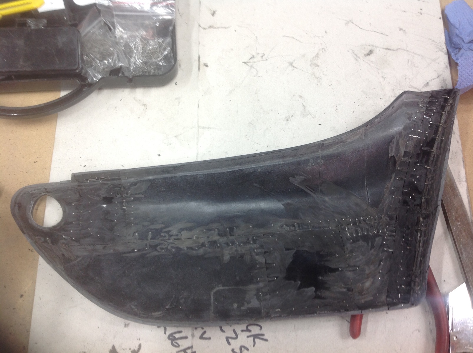 I have finished re-shaping the left side panel so it now fits properly in it's new home and is pulled in a little tighter to narrow the old girl around the waist ( every little helps when you have short legs) I basically cut into three main parts and then added or removed material where necc so it still looks like a KZ panel just a little different (15mm longer at the front, 35mm longer at the back and 25mm shallower in the depth) I have included a before and after comparison with the right side. If you don't have one of these "hot rivet" guns you should get one, even before it was glued it was solid with just the rivets (with plastics getting harder to come by most would be repairable using this method)