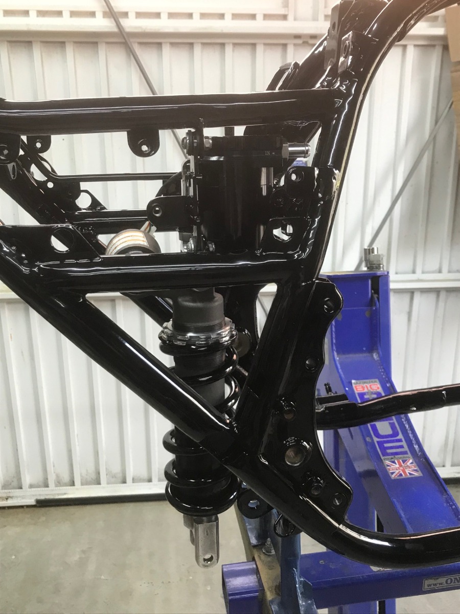 This project has really "turned a corner" this weekend and is finally looking less like a pile of parts. Rear shock is cleaned & reassembled with a freshly coated spring and lower cap and sitting in it's final resting place. Oil catch can and starter solenoid are on, as is the front end. Really glad now I spent the time on the frame, it's not perfect but it's no "show pony" and I'm more than satisfied.