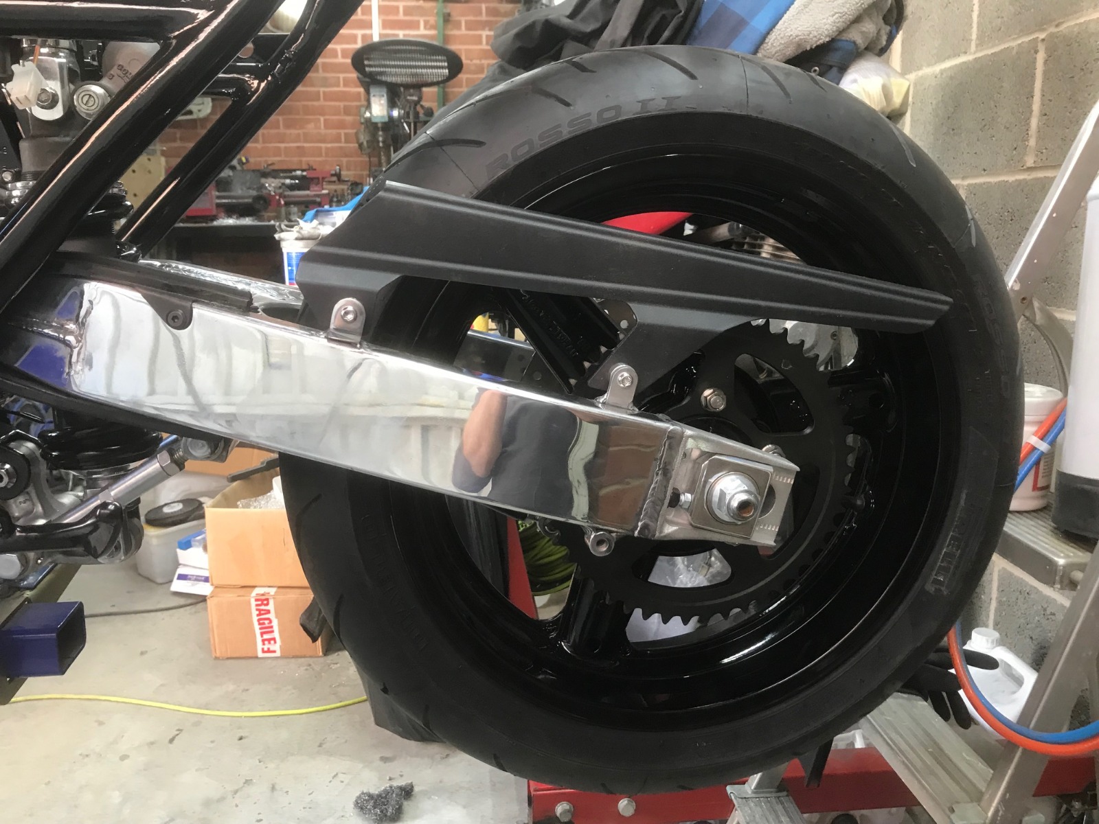 Also managed to get the stand assembled and re-fitted after plating the required parts and fitted the OEM (Suzuki) chain guard with some spacers to move it in as necc, it's going to want a trim though (too long !)