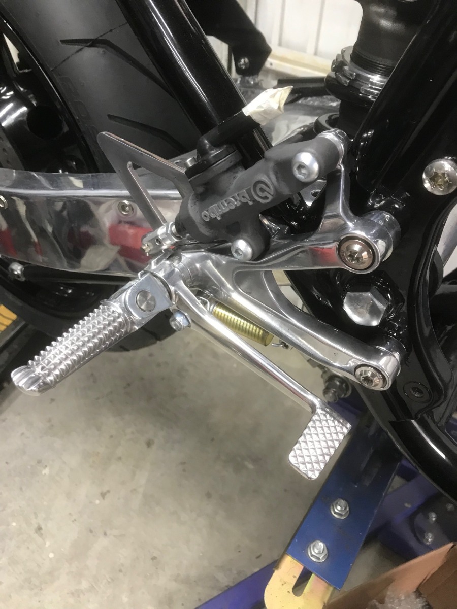 Now with the anodising done I have wrapped up the rear-sets (can't believe how many individual components make up OE rear-sets !!) I wanted to clean and replate the peg mounts and springs so this meant drilling out the riveted factory pins I have made replacements in stainless that are now secured with "E" clips. I have also made a stainless "clevis pin" to connect the rear master to the pedal, this is flush to clear the heal guard and is now secured with a stainless roll pin rather than a rusty split pin. All in all happy with the way things are going